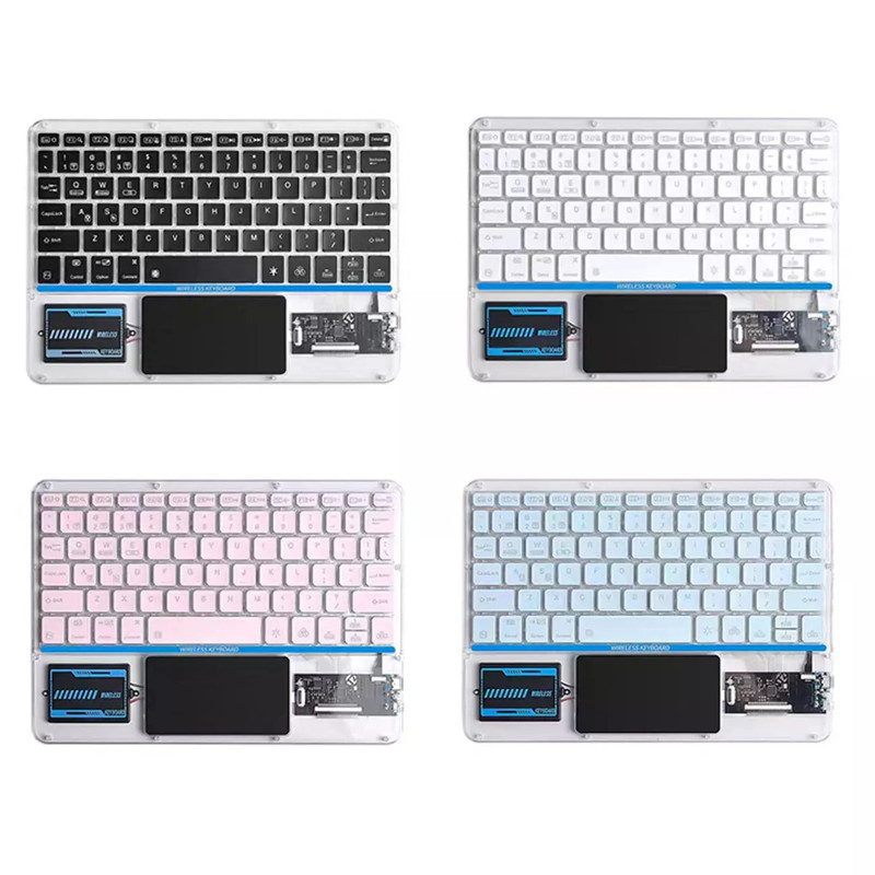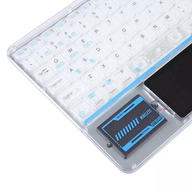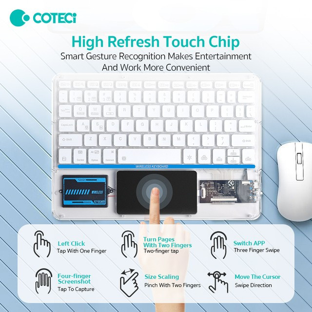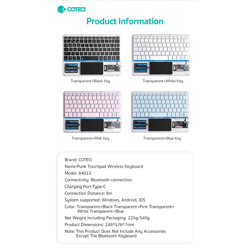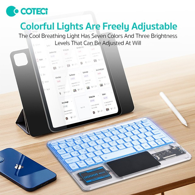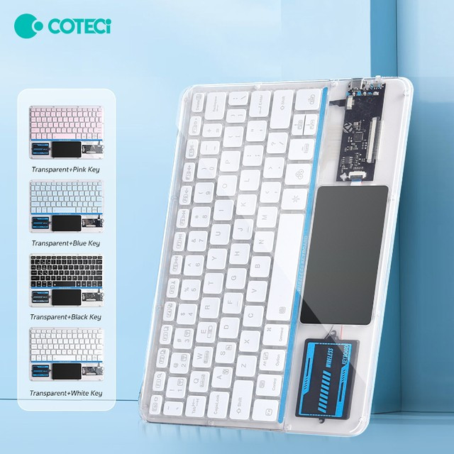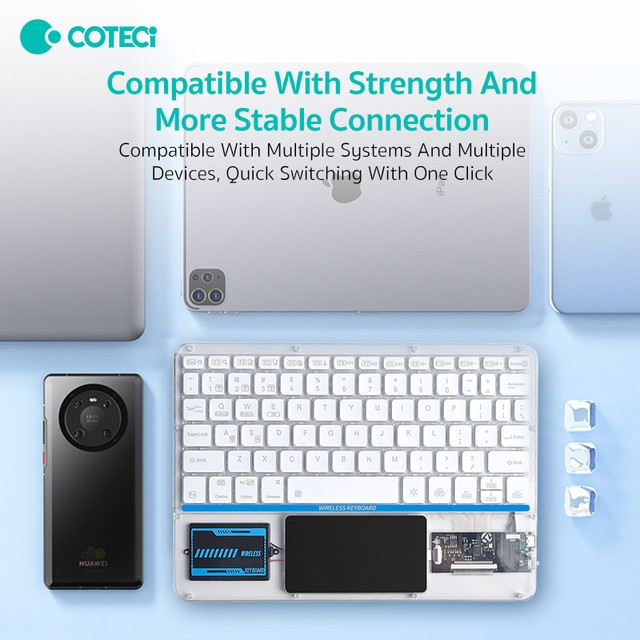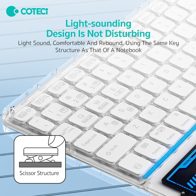 کیبورد بی سیم شفاف COTECI PUNK 84013 یکی از صفحهکلیدهای بسیار جذاب است که میتواند کیفیت روند کاری شما را افزیش دهد. به علاوه کار کردن طولانی مدت با آن موجب خستگی شما نمیشود؛ بسیار خوش دست است و کار با آن راحت و لذت بخش خواهد بود. فوقالعاده ظریف و زیباست و نورپردازی قابل تنظیم هفت رنگ RGB دارد. طراحی جذاب با کلیدهایی در ارتفاع کم دارد که باعث شده صدای اضافه و اذیتکنندهای هنگام تایپ کردن نداشته باشد و در طراحی آنها از سبک سوئیچهای کلیدی بیصدا مانند مک بوک پرو استفاده شده است. همچنین کلیدها ساختار X پای قیچی دارند و نیرو به طور یکنواخت وارد میشود و این ساختار تلاش و خستگی کمتر را به همراه دارد. 84013 دارای صفحه لمسی (Touch Pad) و به بلوتوث 5.2 مجهز است و اتصالی بسیار سریع و پایدار را رقم میزند و اتصال تا 8 متر را ساپورت میکند. از سیستمعاملهای ویندوز، اندروید و iOS پشتیبانی میکند و سازگاری بسیار گستردهای دارد. دارای باتری با عمر فوق العاده طولانی تا 80 ساعت است و با استفاده از درگاه تایپسی و کابل شارژی که همراه آن ارائه شده شارژ میشود.