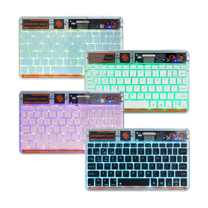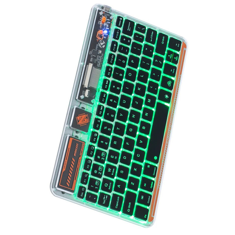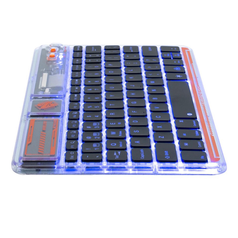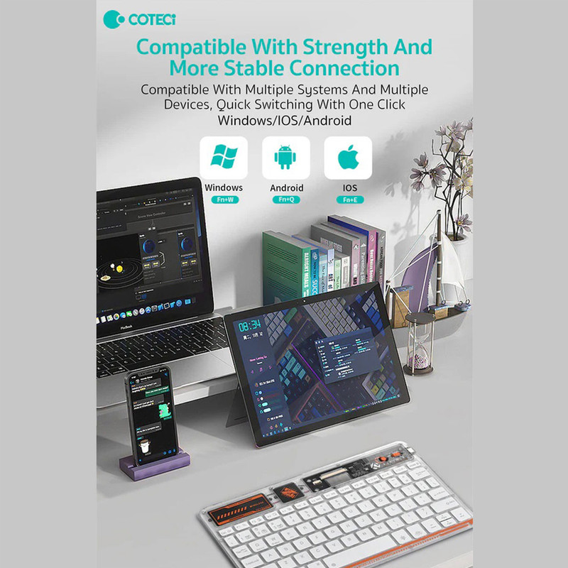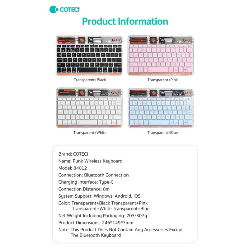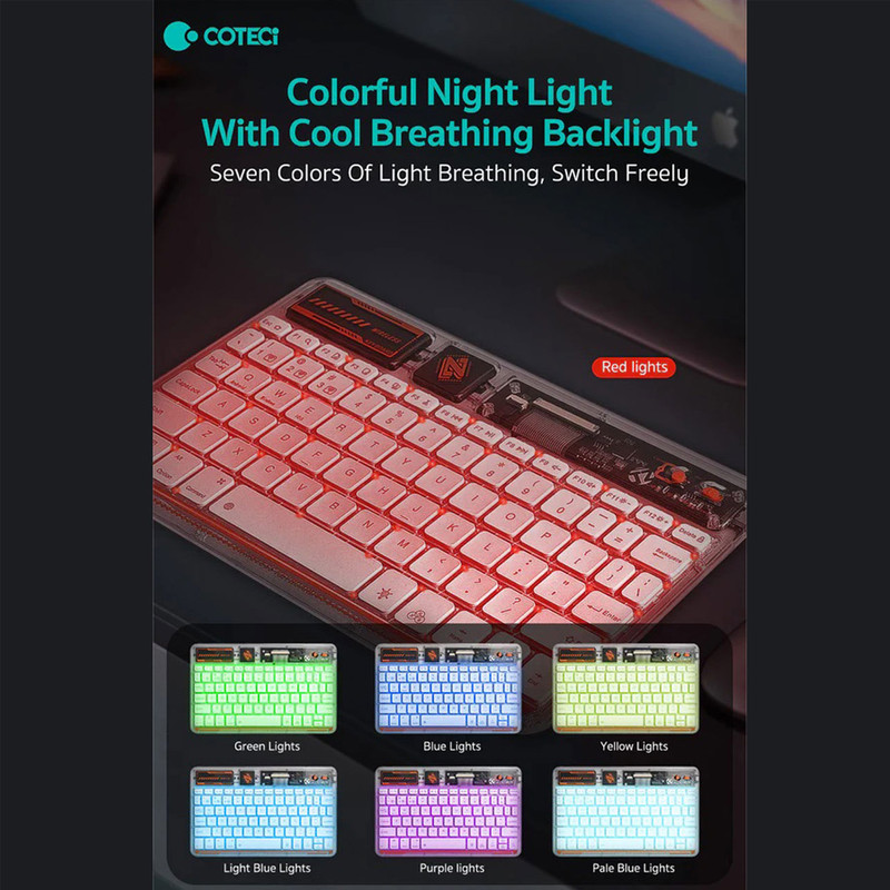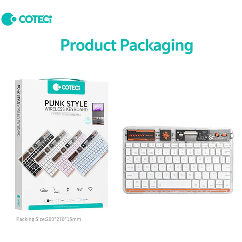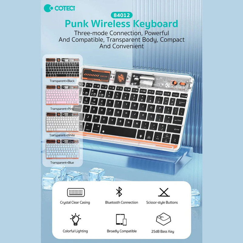کیبورد بی سیم شفاف COTECI PUNK 84012 یکی از صفحهکلیدهای بسیار جذاب است که میتواند کیفیت روند کاری شما را افزیش دهد. به علاوه کار کردن طولانی مدت با آن موجب خستگی شما نمیشود؛ بسیار خوش دست است و کار با آن راحت و لذت بخش خواهد بود. فوقالعاده ظریف و زیباست و نورپردازی قابل تنظیم هفت رنگ RGB دارد. طراحی جذاب با کلیدهایی در ارتفاع کم دارد که باعث شده صدای اضافه و اذیتکنندهای هنگام تایپ کردن نداشته باشد و در طراحی آنها از سبک سوئیچهای کلیدی بیصدا مانند مک بوک پرو استفاده شده است. همچنین کلیدها ساختار X پای قیچی دارند و نیرو به طور یکنواخت وارد میشود و این ساختار تلاش و خستگی کمتر را به همراه دارد. 84012 هم به بلوتوث 5.2 مجهز است و اتصالی بسیار سریع و پایدار را رقم میزند و اتصال تا 8 متر را ساپورت میکند. از سیستمعاملهای ویندوز، اندروید و iOS پشتیبانی میکند و سازگاری بسیار گستردهای دارد. دارای باتری با عمر فوق العاده طولانی تا 80 ساعت است و با استفاده از درگاه تایپسی و کابل شارژی که همراه آن ارائه شده شارژ میشود.