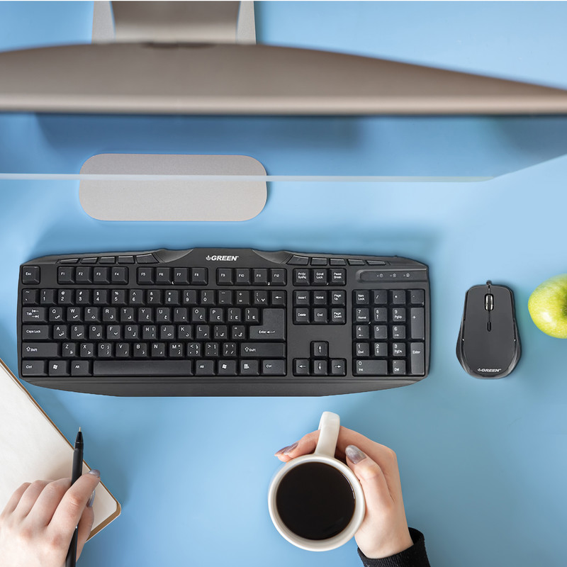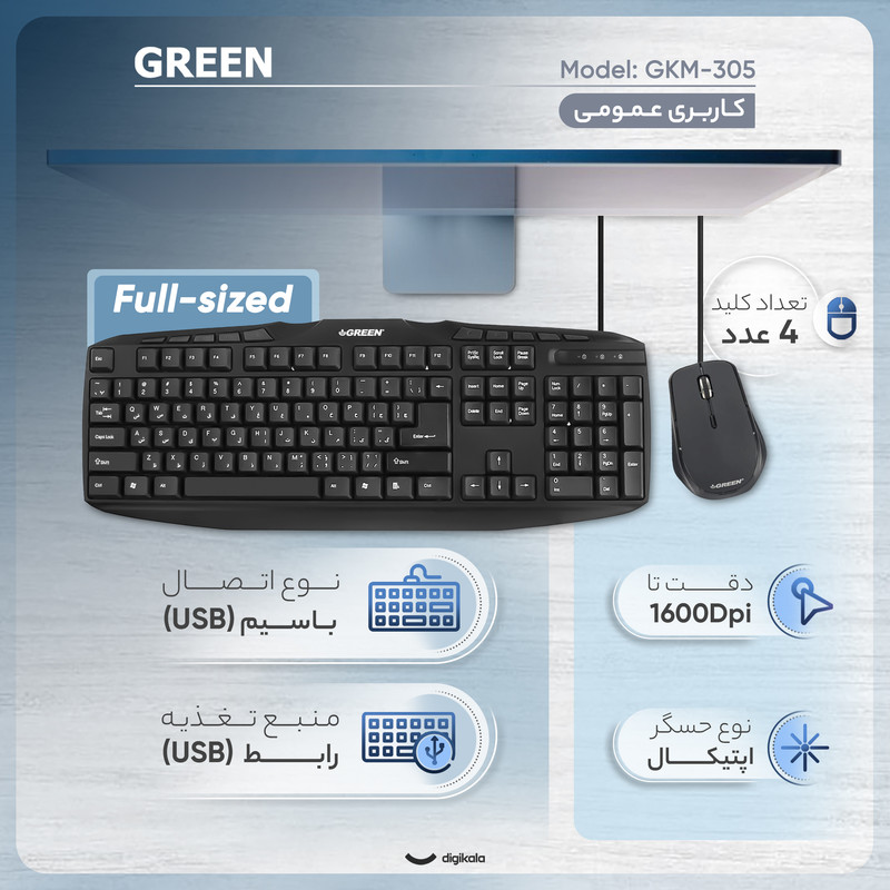 کیبورد و ماوس گرین مدل GKM-305، مجموعهای سیمی و کارآمد است که برای استفاده در محیطهای اداری و منازل طراحی شده است. این مجموعه با ارائه دو ابزار اصلی ورودی کامپیوتر به صورت یکجا، راهکاری اقتصادی و مناسب را برای کاربران فراهم میآورد. کیبورد این محصول از نوع ممبران بوده و با کلیدهایی نرم و بیصدا، تایپ راحت و بیدردسری را به ارمغان میآورد. حروف فارسی به صورت حک شده بر روی کلیدها درج شدهاند که تایپ متون فارسی را برای کاربران فارسیزبان آسان میسازد. اتصال این کیبورد از نوع سیمی و از طریق رابط USB صورت میپذیرد که اتصال پایدار و بدون تاخیری را تضمین میکند. کیبورد GKM-305 دارای ۱۱۴ کلید و ۱۰ کلید میانبر مجزا برای کنترل عملکردهای چندرسانهای است که دسترسی سریع به تنظیمات صدا و پخش رسانه را فراهم میسازد. سازگاری با سیستمعاملهای مختلف ویندوز از جمله نسخههای XP تا ۱۰، از دیگر ویژگیهای این کیبورد است.