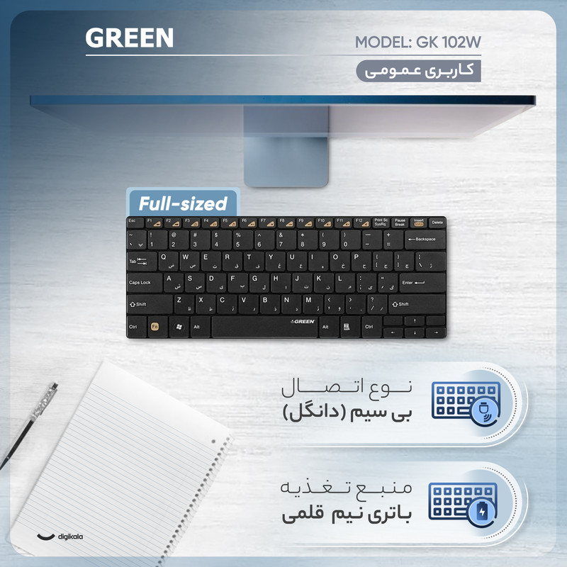 کیبورد بیسیم گرین مدل GK 102W، یک صفحهکلید جمعوجور و سبکوزن است که برای استفاده در محیطهای اداری و خانگی طراحی شده است. این کیبورد با فرم فاکتور Tenkeyless، فضای بسیار کمی از میز کار شما را اشغال میکند و برای کاربرانی که به دنبال کیبورد قابل حمل و کمجا هستند، گزینهای ایدهآل محسوب میشود. بدنه پلاستیکی ABS این محصول با وزن ۲۸۰ گرم، ضمن حفظ سبکی، استحکام مناسبی را ارائه میدهد. کلیدهای سیزر کیبورد GK 102W، تایپ نرم، روان و بیصدا را فراهم میآورند و حروف فارسی حک شده بر روی کلیدها، تایپ فارسی را برای کاربران فارسیزبان تسهیل مینماید. اتصال بیسیم این کیبورد از طریق دانگل USB، اتصالی پایدار و بدون دردسر را به سیستم شما برقرار میسازد. کیبورد GK 102W فاقد بخش اعداد (نامپد) بوده اما دارای ۱۲ کلید میانبر است که دسترسی سریع به عملکردهای پرکاربرد سیستمعامل و نرمافزارها را امکانپذیر میسازد. این محصول از طریق باتری نیمقلمی آلکالاین سایز AAA تغذیه میشود و با سیستمعاملهای مختلف ویندوز سازگار است. در مجموع، کیبورد بیسیم گرین مدل GK 102W، گزینهای مناسب برای کاربرانی است که به دنبال یک کیبورد بیسیم، جمعوجور، سبک، کارآمد و با قیمت مقرونبهصرفه برای انجام امور روزمره خود هستند.