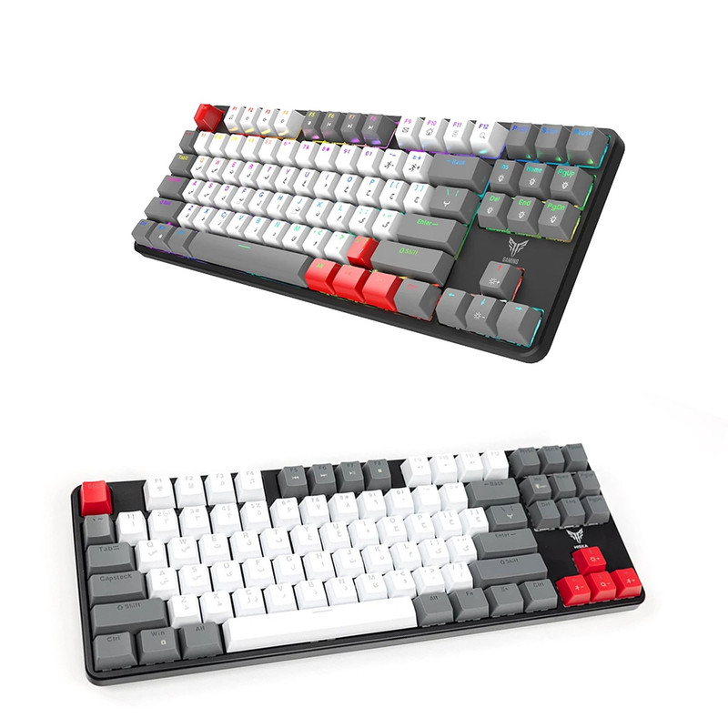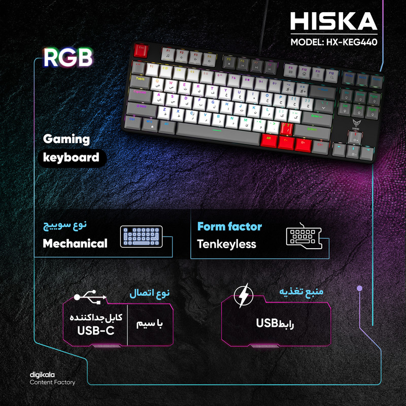کیبورد گیمینگ با سیم هیسکا مدل HX-KEG440 بر اساس ویژگی TKL 80% Compact طراحی و ساخته شده است. این کیبورد گیمینگ با دارا بودن 87 کلید باعث صرفهجویی در فضا شده است. به این شکل میتوانید فضای بیشتری برای حرکت ماوس در اختیار داشته باشید و آزادانهتر ماوس را حرکت دهید. همچنین فرم فکتور TKL 80% Compact به طور قابل توجهای طول کیبورد گیمینگ هیسکا مدل HX-KEG440 را کاهش داده و کلیدهای کافی را برای گیمرها را ارائه میدهد. استفاده از سوئیچهای آبی مکانیکی در کیبورد گیمینگ هیسکا مدل HX-KEG440 صدایی واضح و بازخورد لمسی دقیق را ارائه داده که باعث میشود از بازی لذت بیشتری ببرید. همچنین عمر مفید کیبورد 50 میلیون فشار کلید است. کیبورد مخصوص بازی هیسکا مدل HX-KEG440 با دارا بودن 20 افکت نور پردازی مختلف، جلوه و لذت خاصی را هنگام کار با این کیبورد به شما میدهد. کلیدهای بادوام رنگی سفید و خاکستری و قرمز با ترکیب مینیمالیستی خود جذابیت و جلوه خاصی را به این کیبورد گیمینگ دادهاند. همچنین فونتهای بادوام که هرگز محو نمیشوند، استفاده و تایپ طولانیمدت از کلیدها را امکانپذیر میکنند و ناگفته نماند که این کیبورد دارای فونت فارسی نیز است. کیبورد گیمینگ هیسکا HX-KEG440 به دلیل خوش قیمت بودن و امکانات بسیار جذاب خودش قطعا جز بهترینها تلقی میشود، پس اگر هم دنبال خرید یک کیبورد مقرون به صرفه با امکانات یک کیبورد خوب هستید، در انتخاب خود شک نکنید.