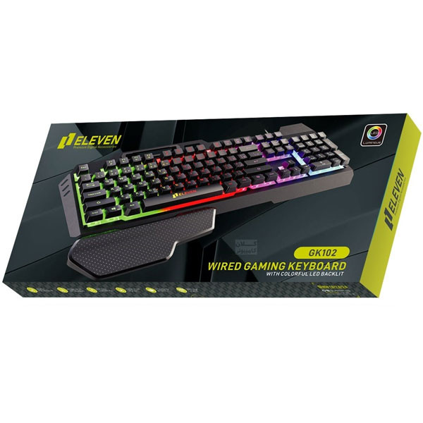 کیبورد گیمینگ ELEVEN مدل GK102 یک کیبورد بسیار با کیفیت است. این کیبورد با نورپردازی چند رنگ و بدنه بسیار مستحکم وساخته شده از جنس پلاستیک با کیفیت و مقاوم در برابر ضربه، فشار و سایر آسیب های فیزیکی و طراحی بسیار جذاب توجه هر گیمری را به خود جلب می کند. کلیدهای این کیبورد دارای حروف فارسی و انگلیسی می باشد و همچنین دارای عمر بسیار طولانی هستند. با نور پردازی کیبورد گیمینگ ELEVEN به صورت چند رنگ همزمان و ثابت در کناره های کلید ها است. از دیگر مزایای این محصول مقاومت در برابر گرد و غبار و آب است.