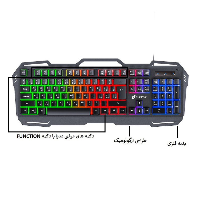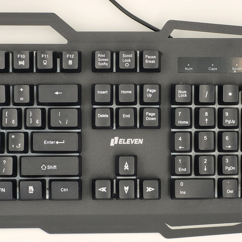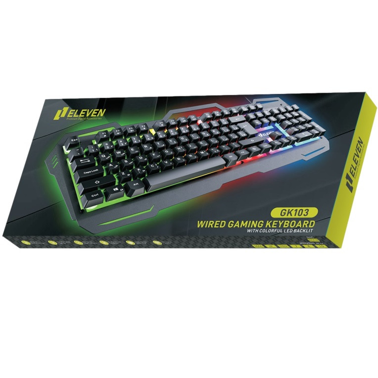 یکی از اصلی ترین قطعات سیستم گیمینگ که گیمر بیشترین استفاده را به صورت مستقیم استفاده میکند کیبورد است و شاید ساعتها در روز دستان شما روی صفحه کیبورد قرار بگیرد. کیبرد گیمینگ GK103 ELEVEN یکی از کیبوردهای کاربردی و خوشساخت ارائهشده به بازار است. این کیبورد مخصوص بازی در دستهی کیبوردهای سیمدار قرار میگیرد و از طریق اتصال USB به کامپیوتر وصل میشود. این کیبورد گیمینگ از تعداد 104 کلید به همراه کلید های مولتی مدیا به صورت فانکشنال برخوردار است. مهمترین ویژگی GK103 کلیدهای آن است که سرعت پاسخدهی بالا همراه با طول عمر زیاد ( تا 10 میلیون بار ) آورده است. این ویژگی به گیمر این اجازه را میدهد تا بتواند با خیال راحتتری بازی کند و دیگر نگران این نباشد که در هنگام فشردن همزمان چند کلید، یک یا چند عدد از آنها در بازی ثبت نشوند. نور پسزمینه قابل تنظیم و ظاهری شیک از دیگر ویژگیهای این محصول هستند که هم میتوانند تداعیگر یک صفحهکلید گیمینگ و هم نمایانگر یک صفحهکلید بسیار مناسب مخصوص کارهای روزانه باشند. بدنه این کیبرد از فلز ساخته شده تا ظاهری فوق العاده داشته باشد. اگر هر از گاهی به بازی میپردازید، میتوانید کیبورد گیم GK103 کمپانی ELEVEN را تهیه کنید که بیشتر قابلیتهای یک کیبورد گیمینگ کاملاً حرفهای مثل نورپردازی RGB ، دکمههای برجسته با جابهجایی زیاد و سطح فرورفته، بدنه فلزی با طراحی گیمینگ استفاده کنید.