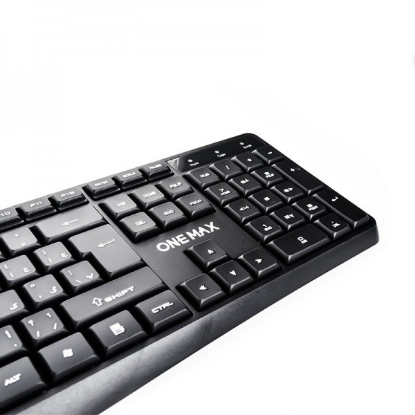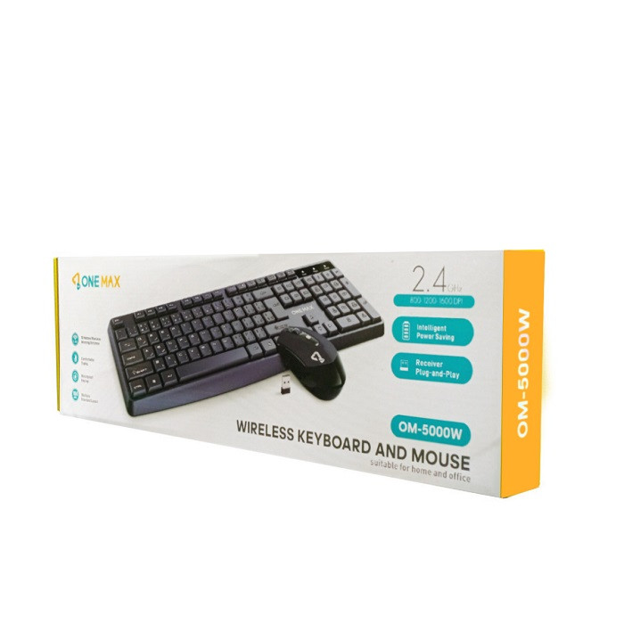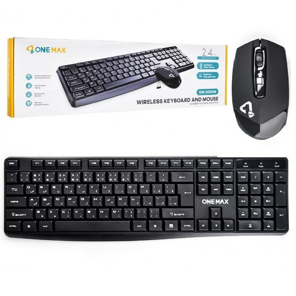 کیبورد و موس بیسیم وان مکس ONE MAX OM-5000W. مناسب برای استفاده در خانه و محل کار است.کیبورد وان مکس ضد آب طراحی شده و دارای کلید های بی صدا و راحت است. تعداد کلید ها به صورت استاندارد 104 کلید است.کیبورد وان مکس از نسخه چند زبانه پشتیبانی میکند. موس بیسیم این محصول برای چپ دست ها و راست دست ها و همچنین دست ها با سایزهای مختلف طراحی شده است. که این امکان را به کاربر می دهد تا از هر جهت روی صفحه حتی به صورت مورب حرکت کند. و باعث شود صفحات وب بزرگ مشاهده شود.کار کردن با این موس روی هر سطوحی بجز شیشه و آینه امکان پذیر است.