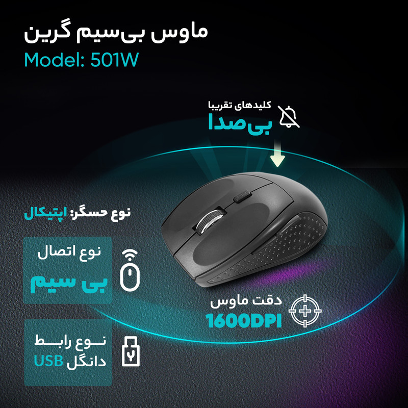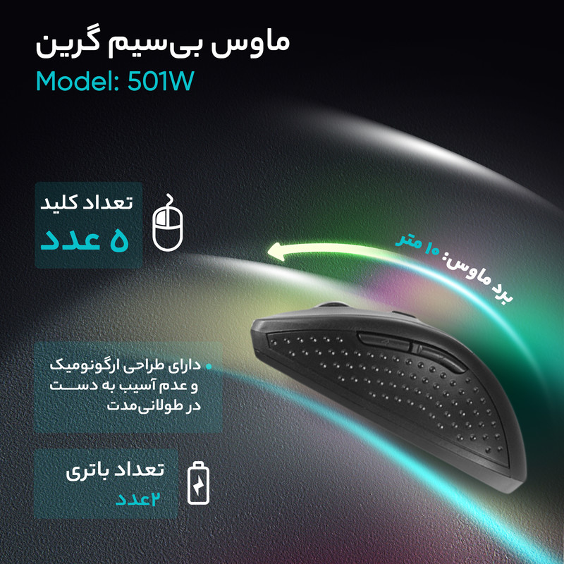 «GM-501W» یک ماوس بیسیم همراه با حسگر اپتیکال است که توسط کمپانی «گرین» طراحی و تولید شده است. همانطورکه گفتیم این ماوس از یک حسگر اپتیکال برای مکانیابی بهره میبرد که با دقتی برابر با 1600 نقطه در اینچ، قادر است عملکرد مناسبی را به شما ارائه دهد؛ همچنین شما میتوانید متناسب با کاری که انجام میدهید و دقتی که برای انجام آن کار نیاز دارید، دقت حسگر را به 800 نقطه در اینچ تغییر دهید. ماوس گرین GM-501W دارای 5 عدد کلید است که 2 عدد از آنها همان کلیدهای چپ و راست هستند و در قسمت پایین کلیدهای چپ و راست یک کلید برای تغییر دقت تعبیه شده است. دو کلید دیگر نیز در سمت راست و قسمت کناری طراحی شدهاند که قابلیت برنامهریزی هم دارند. این ماوس از تکنولوژی بیسیم برای ارتباط با لپتاپ یا کامپیوتر بهره میبرد و برای استفاده از آن فقط کافی است، گیرنده را به پورت USB لپتاپ یا کامپیوتر خود متصل کرده و بهراحتی از ماوس استفاده کنید. GM-501W برای ارتباط سریع و بدون وقفه از تکنولوژی 2.4GHz استفاده میکند و معمولا توانایی ارتباط با کامپیوتر یا لپتاپ را در فواصلی میان 6 تا 10 متر دارد. GM-501W انرژی مورد نیاز خود را از طریق دو عدد باتری قلمی آلکالاین با سایز AAA تامین میکند و علیرغم مصرف پایین، به یک دکمهی خاموش و روشن نیز جهت صرفهجویی در مصرف انرژی مجهز گشته است. طراحی این ماوس ارگونومیک و بسیار خوشدست است و فقط برای دست راست طراحی و تولید شده است.