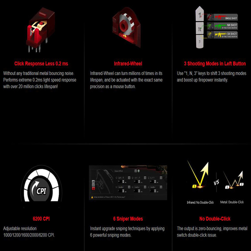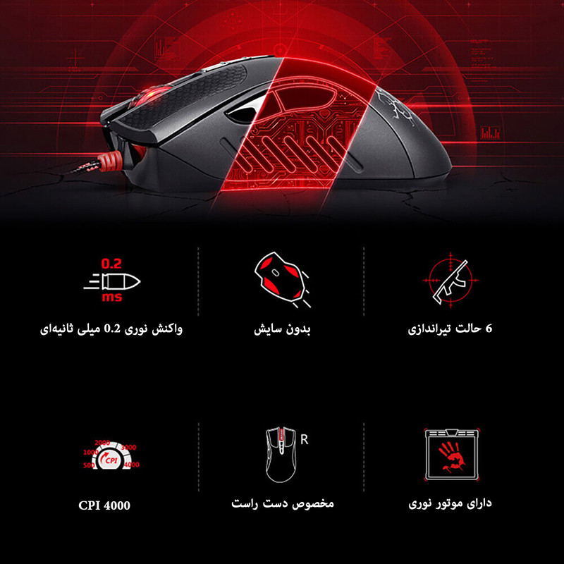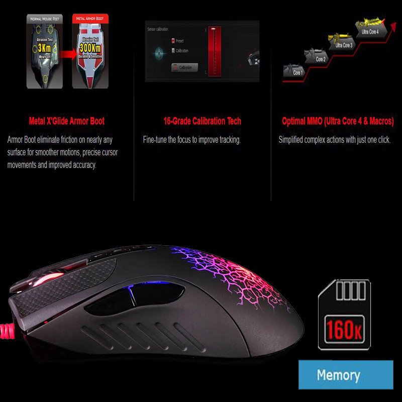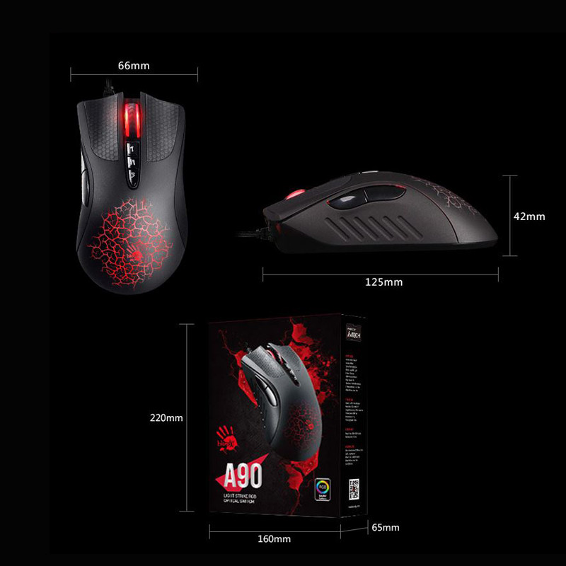 ماوس A90 از سری محصولات BLOODY(گیمینگ) شرکت A4TECH میباشد که بر اساس جدید ترین متدهای استاندارد دقت و سرعت طراحی گشته است که شما را قادر میسازد اهداف خود را با نهایت سرعت و دقت مورد اصابت قرار دهید . یکی از ویژگیهای منحصر به فرد محصولات بلودی ظاهر زیبا وجذاب انها برای گیمرها و دیگر مصرف کنندگان میباشد. به گفته شرکت ایفورتک محصول A90 مانند دیگر محصولات سری بلودی با سرعت پاسخ گویی به هر کلید تنها در 0.2 ثانیه به کمک میکرو سوئیچهای مادون قرمز ، سریع ترین ماوس موجود در بازار میباشد. به شما این امکان را میدهد که با 6 حالت متفاوت قدرتمند تیرندازی کنید. طراحی شده برای راست دستها ( شرکت A4TECH برای افراد چپ دست ماوس MOUSE BLOODY A4TECH V 8M را در نظر گرفته است که مناسب برای استفاده هر دو دست میباشد ). به دلیل دارا بودن 4 هسته ماکرو تمام اقدامات سخت و پیچیده را تنها با کلیک انجام دهید. دارای وضوح و سرعت 4000 CPI (قابل تنظیم بر روی 4000 ,1600 ,1200 ,1000 ,800). با استفاده از میکرو سوئیچهای مادون قرمز علاوه بر افزایش چشمگیر سرعت ، به دلیل کاهش ساختار فیزیکی و اصتحکاک عمر محصول نیز تا 20 میلیون کلید افزایش پیدا کرده است. دارای Armor Boot که کاهش اصطکاک و افزایش دقت و سرعت تقریبا روی تمام سطوح است. این ماوس با داشتن 8 کلید به شما کمک می کند که تنها با زدن یک کلیک نوع تصویر برداری را تغیر دهید و قدرت شلیک را افزایش یا کاهش دهید ، همچنین شما می توانید با دانلود نرم افزار Bloody 6 برای دکمه های سمت چپ ماوس عملکرد هایی را از پیش تعیین کنید