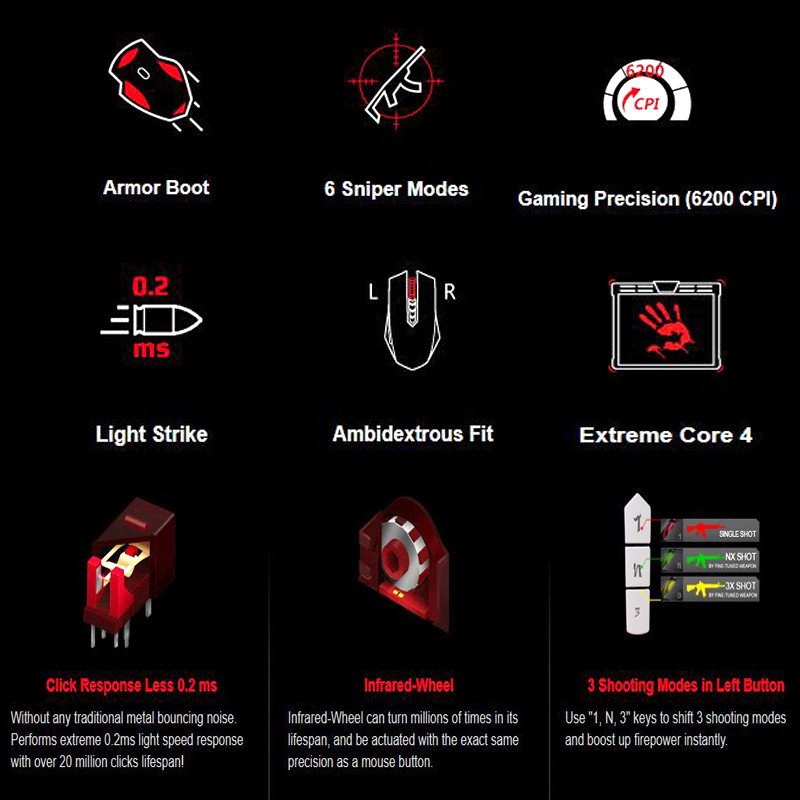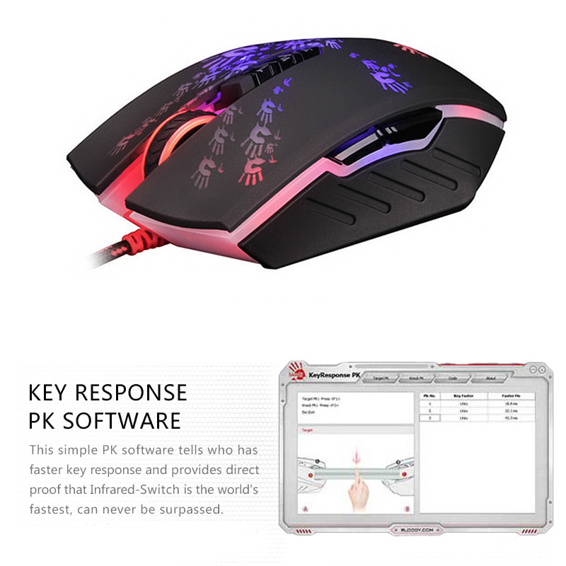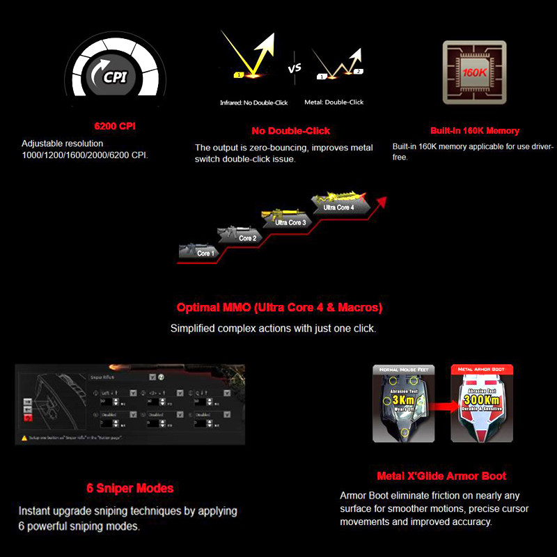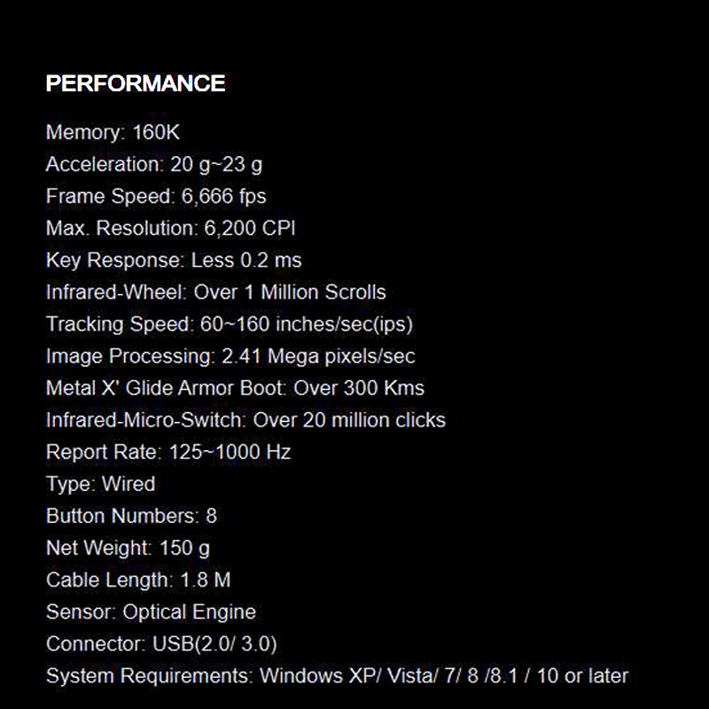 ماوس گیمینگ تمام عیار با سرعت پاسخ دهی کمتر از 2 ثانیه. دکمه دابل کلیک و کلید های قابل برنامه ریزی ( منوط به دانلود درایور ). یکی از ویژگی های این ماوس DPI قابل تنظیم است. این ماوس دارای کمربند ضد تعریق جهت استفاده طولانی مدت است .