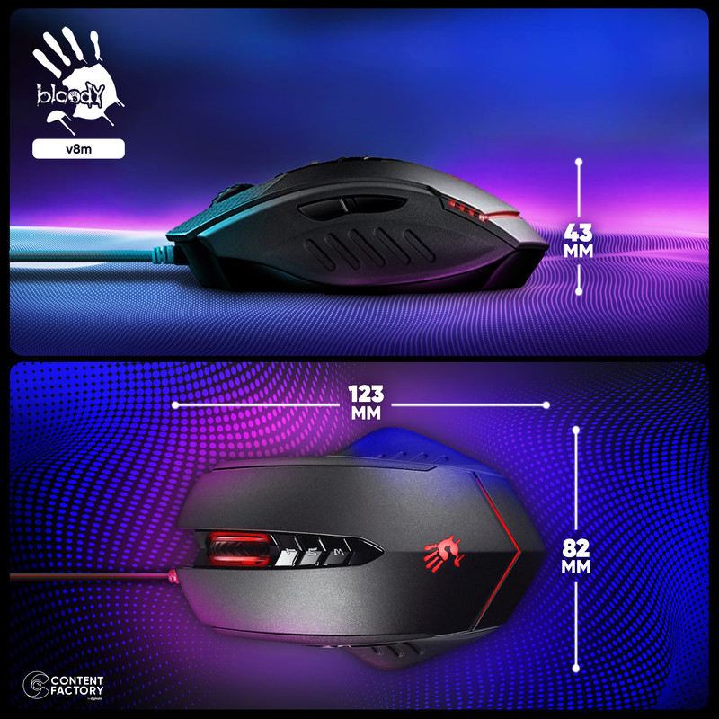 A4tech یکی از بزرگ ترین شرکت های تولید کننده تجهیزات و لوازم جانبی کامپیوتر در جهان می باشد. این شرکت محصولات گیمینگ خود را با نام تجاری Bloody وارد بازار کرده است. در این محصولات از جدیدترین تکنولوژی های روز دنیا و بهترین متریال استفاده شده است. ماوس گیمینگ بلودی V8M دارای 6 حالت تیراندازی در بازی های اکشن می باشد. ماوس A4tech V8M با دقت 3200 CPI ، یکی از دقیق ترین ماوس های موجود در بازار می باشد. ماوس های گیم بلودی مزیت منحصر به فردی دارند و آن داشتن سرعت بی نظیر موتور بازی در سراسر دنیا است و شما می توانید در بازی اهدافتان را با سرعت و دقت بیشتری مورد اصابت قرار بدهید.