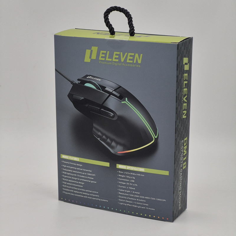 برند ELEVEN یکی از برندهای مطرح در زمینه تولید لوازم جانبی کامپیوتر و گیمینگ است. محصولات ELEVEN شامل ماوس مخصوص بازی ELEVEN مدل GM10، کیبوردها، هدستها، پد ماوس و سایر لوازم جانبی کامپیوتر و گیمینگ میشوند. طراحی زیبا، استفاده از فناوریهای نوین و توجه به نیازهای کاربران، از ویژگیهای برجسته این برند است. این ماوس با وزن 130 گرم و ابعاد ۱۲۹x۸۷x۴۰ میلیمتر، دارای 8+1 عدد کلید است و یک آپشن قدرتمند آن داشتن نرم افزار شخصی سازی هستش GM10 از نوع با سیم بوده و از رابط USB برخوردار است. محدوده دقت آن بیشتر از ۳۲۰۰ DPI است و دقت آن در محدوده ۲۴۰۰ تا ۴۸۰۰ تا ۱۲۸۰۰ DPI قرار دارد و POLLING RATE این ماوس 1000 HZ میباشد که سرعته عالی دارد. همچنین دارای طول کابل ۱۸۰ سانتیمتر و میران ضربهپذیری کلیدهای آن تا سه میلیون کلیک بوده که آن را به یک ماوس با مقاومت تبدیل کرده است. این ماوس با سیستم عاملهای Window/Linux/Android/Mac OS سازگاری دارد. با توجه به این مشخصات، ماوس ELEVEN مدل GM10 یک گزینه عالی برای علاقمندان به بازیهای رایانهای است و میتواند تجربه بازی شما را بهبود بخشد.