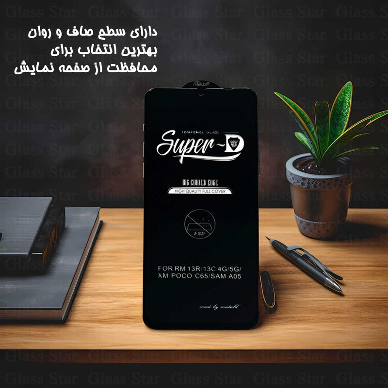 صفحه نمایش گوشی بسیار حساس است و ممکن است در اثر ضربه یا خط و خش آسیب ببیند. محافظ صفحه نمایش گلس استار مدل سوپردی (SUPER-D) به عنوان یک محافظ قدرتمند و با کیفیت است و استفاده از آن برای گوشی موبایل شما یک گزینه ایده آل به شمار می رود. این محافظ صفحه نمایش، تمام قسمت های صفحه نمایش را به صورت کامل پوشش داده و اجازه نمی دهد به صفحه نمایش گوشی شما آسیبی برسد. حاشیه اطراف آن، ابعاد صفحه گوشی شما را کوچک نمی کند و دارای قابلیت هایی همچون نصب آسان، عدم ایجاد حباب ، لمس روان و سریع و همچنین عدم کاهش کیفیت تاچ و شفافیت صفحه نمایش است که کار کردن با گوشی را برای شما راحت تر می کند. مکانیزم ساخت گلس مدل سوپر دی، از جنس شیشه حرارت دیده می باشد. لبه های گرد و منحنی دارد و در برابر ضربه و خط و خش از مقاومت بالایی برخوردار است که از آسیب دیدن صفحه نمایش نیز جلوگیری می کند. در واقع گلس مدل SUPER-D با توجه به کیفیت قابل توجه آن، قیمت مناسبی داشته که شما می توانید بدون نگرانی آن را برای گوشی خود تهیه نمائید.این گلس به همراه یک اسپری الکل و دستمال که برای تمیز کردن صفحه نمایش است ارسال می شود.