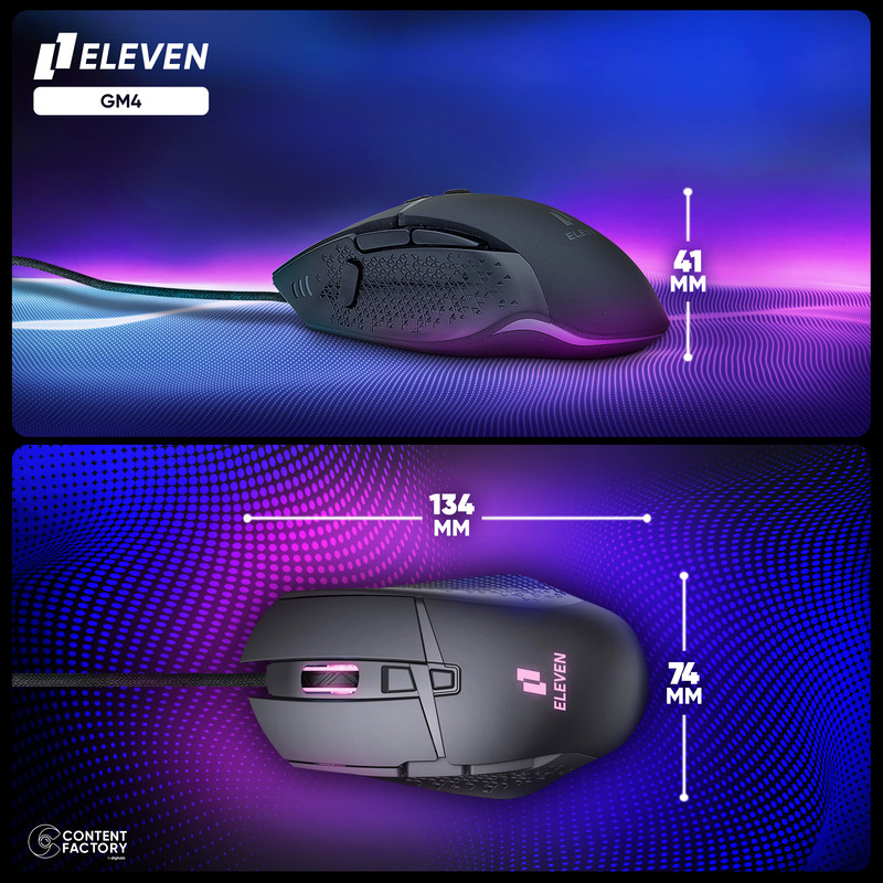 ماوس GM4 محصولی از شرکت ELEVEN است که برای انجام بازیهای کامپیوتری طراحیشده است. ماوس مخصوص بازی GM4 از طریق کانکتور USB با کابل کنفی به کامپیوتر متصل میشود و دارای کلیدهای قابل برنامهریزی است. شرکت ELEVEN به همراه این محصول نرمافزار مخصوصی ارائه کرده که به کمک آن میتوان هرکدام از کلیدهای ماوس را برای انجام فعالیت خاصی در نظر گرفت تا سرعت انجام فعالیتها تا حد زیادی افزایش یابد. در قسمت انتهایی ماوس لوگوی شرکت ایلون مشاهده میشود که دارای نور پسزمینه است. رنگ این نور را میتوان به کمک نرمافزار ارائهشده تغییر داد. یکی از فاکتورهای بسیار مهم هنگام تهیهی یک ماوس برای بسیاری از کاربران حرفهای میزان دقت ماوس است که با DPI شناسایی میشود. حداکثر دقت ماوس GM4 برابر با 7200 نقطه بر اینچ است که دقت بسیار مطلوبی به شمار میرود و قابلیت تنظیم کردن از 1600 DPI را داراست. در قسمت پایینی کلید اسکرول در ماوس ELEVEN مدل GM4 دو کلید DPI قابل مشاهده است که وظیفهی تغییر میزان دقت ماوس را برعهده دارد. به کمک این کلید میتوان با توجه به نوع فعالیت در حال انجام میزان دقت ماوس را انتخاب کرد. این محصول از همه سیستمعاملها پشتیبانی میکند و با زمان پاسخگویی 1 میلی ثانیه محصولی بسیار کاربردی به شمار میرود. نرم افزار این ماوس را میتوانید از سایت خود محصول دانلود کنید تا بتوانید از تمامی کارایی ماوس استفاده کنید. این ماوس هشت کلید با دکمه ایی که سمت راست ماوس هستش میتوان یک میانبر فوق العاده کارامد در زمان بازی داشته باشد. در زمان عوض کردن DPI نور پس زمینه ماوس تغییر میکند تا شما بهتر متوجه تغییر کردن DPI بشوید.
