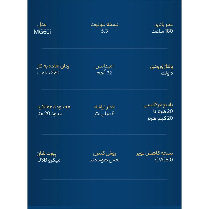 هدفون بلوتوثی مدل MG60i.New تجربهای بینظیر از موسیقی و مکالمه را با کیفیتی مطلوب ارائه میدهد. این هدفون با فناوری TWS، طراحی ارگونومیک و وزن ۱۱۷ گرمی، صدایی فراگیری را تولید میکند که برای بازی، گوشدادن به موسیقی یا تماشای ویدئو در طولانیمدت ایدهآل است. بدنه پلاستیکی مقاوم و گواهی IP54، این محصول را در برابر گردوغبار و پاشش آب مقاوم کرده و برای استفاده روزمره یا فعالیتهای سبک مناسب است. درایورهای 8 میلیمتری، پاسخ فرکانسی ۲۰ تا 20000 هرتز، حساسیت ۴۲ دسیبل و امپدانس 32 اهم، کیفیت صدای متعادل همراه صدایی شفاف با بیس قوی تولید میکنند. فناوری نویز کنسلینگ CVC8.0 با کاهش صداهای مزاحم محیط، تجربهای لذتبخش را بهویژه در محیطهای شلوغ فراهم میآورد. میکروفون با کیفیت موجود در هدفون بلوتوثی مدل MG60i.New، مکالمات را با وضوح بالا و بدون نویز پسزمینه ارائه میدهند. این هدفون از بلوتوث نسخه 5.3 بهره میبرد که اتصالی پایدار و سریع هم زمان به دو دستگاه را تا فاصله مناسب فراهم میکند. دکمههای لمسی روی هدفونها کنترل موسیقی و تماسها را سادهتر کردهاند. باتری هدفون با 6 ساعت پخش عملکرد قابلاعتمادی دارد که برای کاربری عمومی، از مکالمه گرفته تا گوشدادن به پادکست، انتخابی کارآمد و مدرن است.