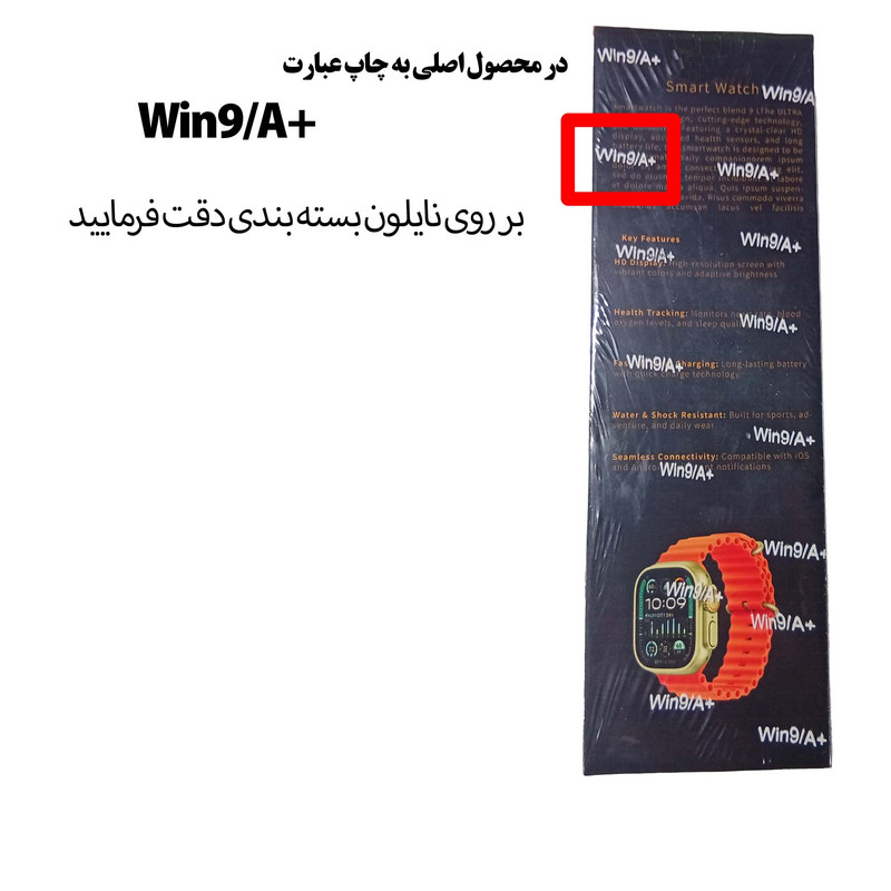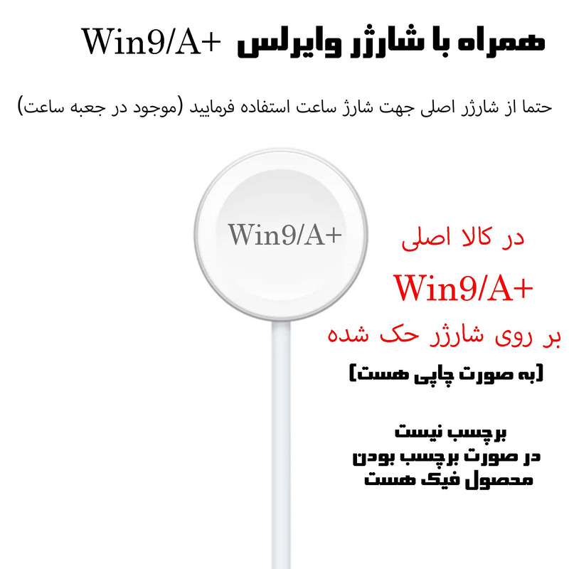 این مدل تمام امکاناتی که از یک ساعت هوشمند نیاز دارید را در خود جای داده: پایش ضربان قلب، وضعیت خواب، ثبت فعالیتهای ورزشی، هشدار پیامها، نمایش نوتیفیکیشن، کنترل پخش موسیقی و کنترل دوربین. اما نکتهای که این ساعت را از دیگر مدلها متمایز میکند، اصالت واقعی آن است. نسخه اصلی Win 9A+ روی قاب پشت ساعت، روی شارژر وایرلس داخل جعبه و روی نایلون بستهبندی، عبارت Win9/A+ را بهصورت حکشده و چاپی دارد. اگر این علامت به شکل برچسب باشد، محصول فیک است.
