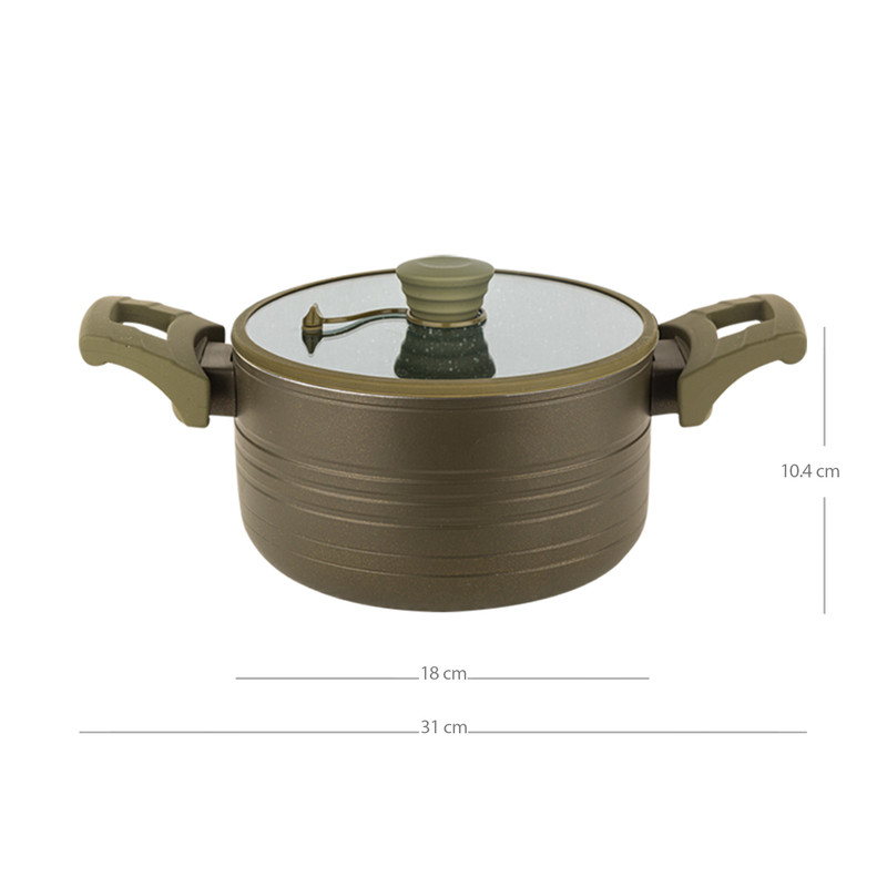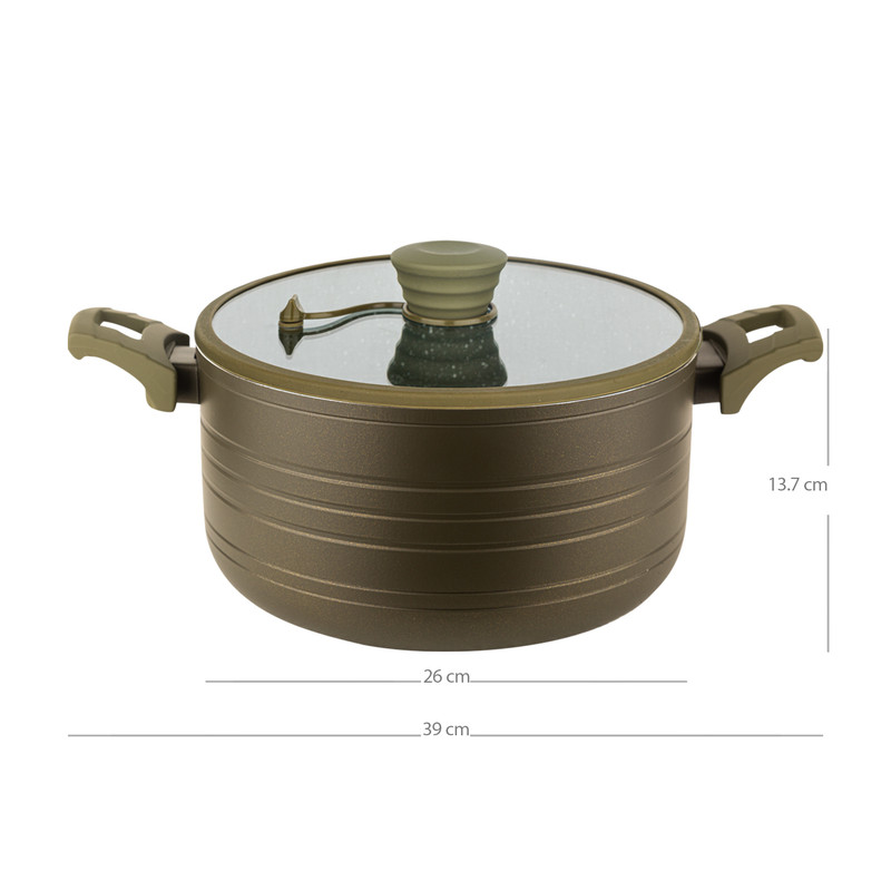 این سرویس 3 قابلمه در سایز های 18 ،22 و 26 سانتی متری دارد و دو تابه با سایز های 22 و 26 و 3 درب سیلیکونی که درب بین قابلمه های 22 و 26 با تابه ها مشترک میباشد .
