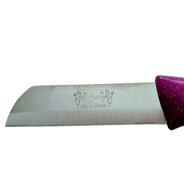 چاقوی ارهای زولینگن(solingen) آلمانی لیزری با سطح صیقلی و براق، دارای تیغهای بلند و تیز به طول ۹ سانتیمتر است. این مدل برای کارهای روزمره آشپزخانه مانند پوست کندن سیبزمینی و پیاز بسیار مناسب است. چاقویی بادوام، خوشدست و با طول عمر بالا که از پرطرفدارترین چاقوهای آشپزخانه محسوب میشود. دستهی اکلیلی زیبا در رنگهای زرشکی و بنفش، جلوهای خاص و چشمنواز به این محصول داده است.این کالا ۱۰۰٪محصول اصل و با کیفیت است.