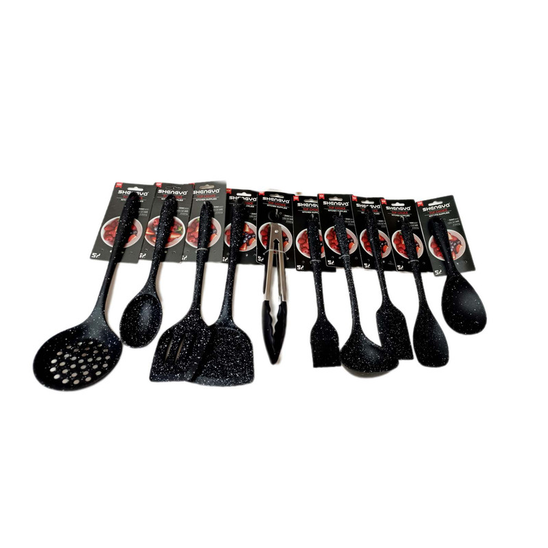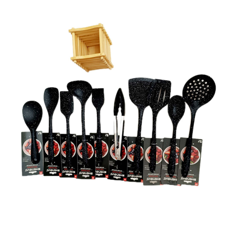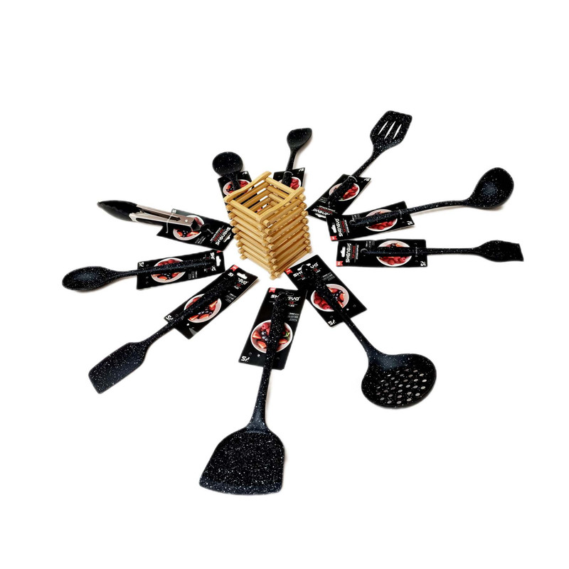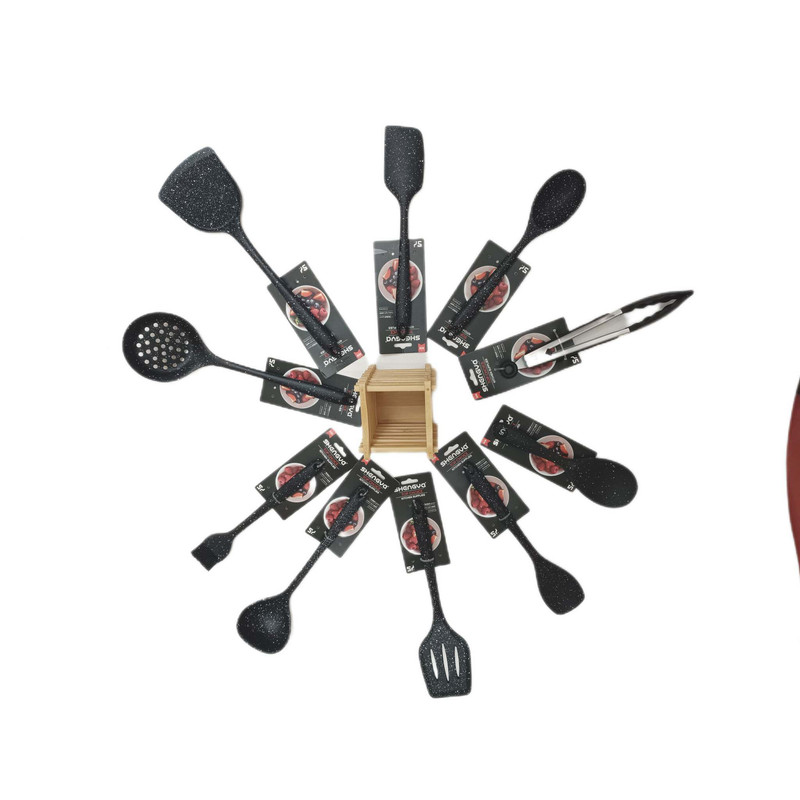 شامل انبر سیلیکون قفل دار, فرچه و لیسک بلند 26 .4, قاشق28.6 و کفگیر ساده 32.9و کفگیر سوراخ دار32.9 و کفگیر شیاردار30.8 ,ملاقه 32.9و کفگیر پارویی دسته کوتاه22.7 و کفگیر لیسکی 28.6 جا قاشقی بامبو