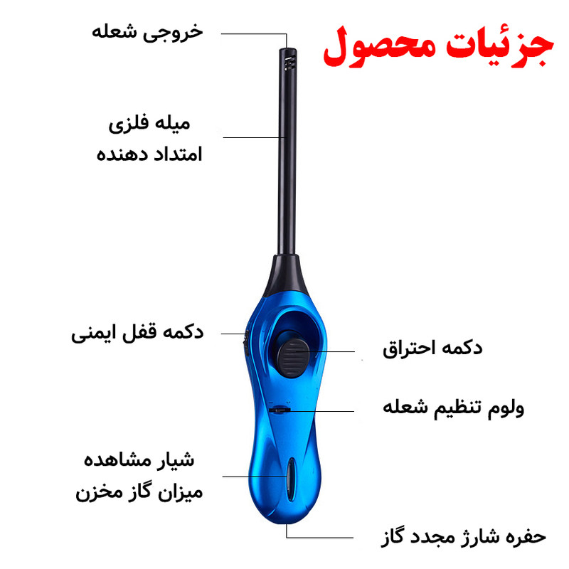 سایر توضیحات : رنگ متالیک بسیار جذاب - مخزن گاز بسیار بزرگ - بدنه دارای شیار جهت مشاهده میزان گاز موجود در مخزن - دارای قابلیت تنظیم میزان شعله - میله بلند جهت ایمنی بیشتر و فاصله بیشتر دست از شعله در هنگام استفاده - دارای قفل کودک - قابلیت شارژ مجدد مخزن گاز