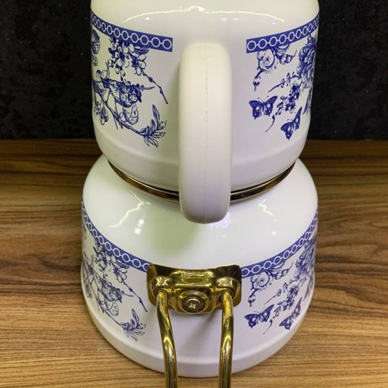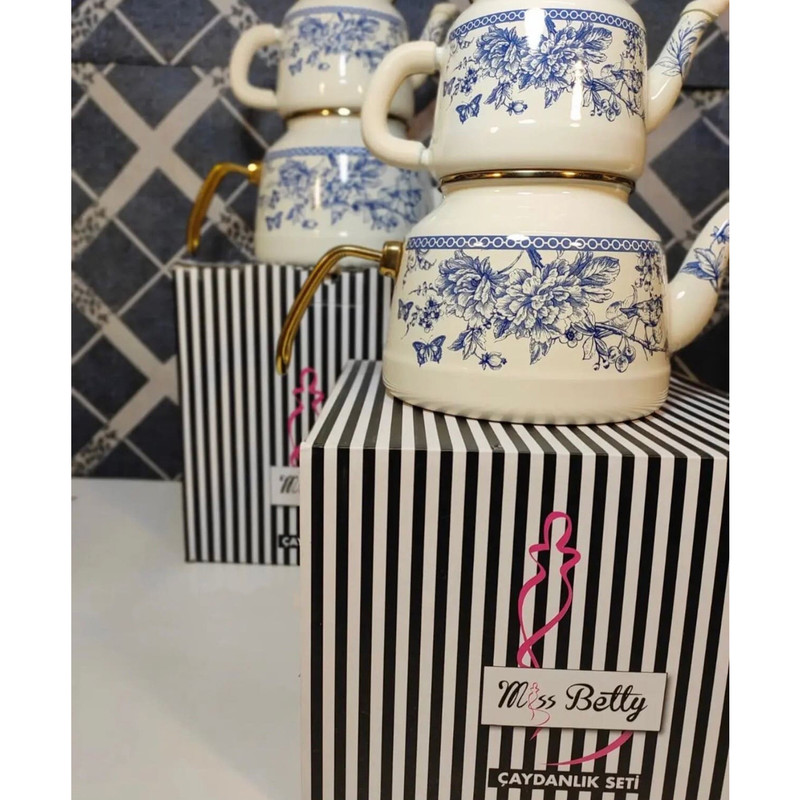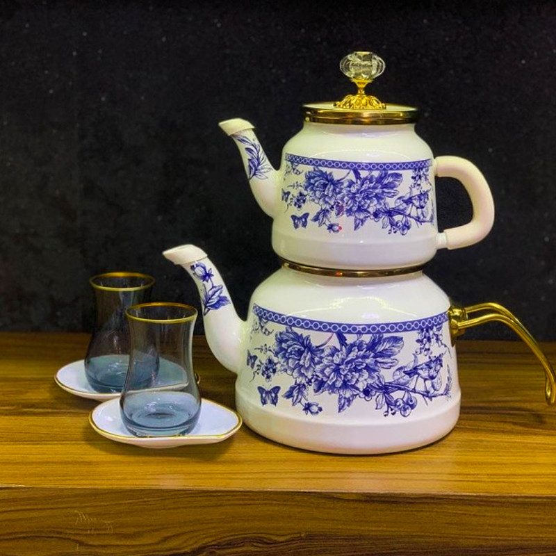 قوری کتری لعابی مدل دافی یک قوری کتری شناخته شده از کشور ترکیه میباشد که طذپرح زیبا و ظریف با گلهای ابی دارد ویک طرح کلاسیک از این برند است قوری داریدرب میباشد ولی کتری درب ندارد و یک مجموعه سه تکه میباشد برای شعله مستقیم اسن بدون تغییر رنگ سالها یار اشپزخانه شما خواهد بود قوری دارای دسته سیلیکونی میباشد که قابل جدا شدن است برای جلوکیری از داغ شدن دست شما قسمت سر لوله قوری وکتری هم دارای محافظ سیلیکونی میباشددرب قوری دارای دستگیره بشکل گوی الماس است که بخودی خود بسیار منحصربفرد میباشد گنجایش کتری2.5 لیتر وگنجایش قوری 1.1 لیتر میباشد قطر کتری 18سانتیمتر ارتفاع 14 سانتیمتر است وزن کتری یک کیلو گرم میباشد قطر قوری 13 سانتیمتر ارتفاع با درب 18 سانتیمتر است وزن قوری685 گرم میباشد