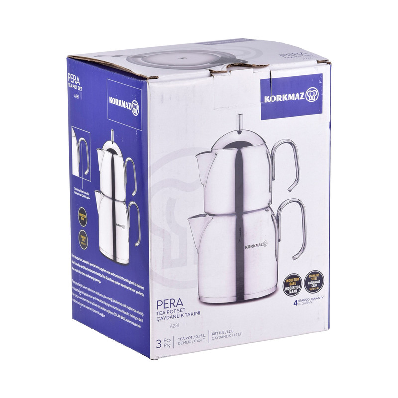 کتری و قوری پرا کرکماز ۲۸۱ نمادی از کیفیت و زیبایی ترکیهای در آشپزخانه شماست. این ست منحصر به فرد از استیل ضد زنگ کروم-نیکل ۱۸/۱۰ ساخته شده که درخشش بینظیری داشته و در برابر خوردگی و تغییر رنگ کاملاً مقاوم است. طراحی هوشمندانه و فنی این محصول با تکیه بر کفه سه لایه سوپر کپسولی آن، توزیع حرارت را به صورت همگن انجام داده و باعث جوش آمدن سریع آب و صرفهجویی محسوس در انرژی میشود. با ظرفیت مناسب کتری (۱.۲ لیتر) و قوری (۰.۶۵ لیتر)، این ست کاملاً ایدهآل برای مصارف روزانه و پذیرایی از مهمانها طراحی شده است.