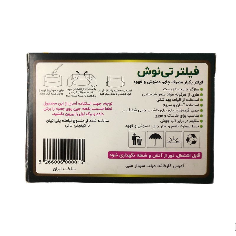 فیلتر چای تی نوش سازگار با محیط زیست و عاری از هر گونه ماده شیمیایی است.این محصول گرده های چای را جذب می کند و باعث شفاف تر شدن چای می شود و طعم چای و دمنوش و قهوه را حفظ می کند. این محصول مناسب قوری و فلاسک است و در برابر آب جوش مقاوم است.