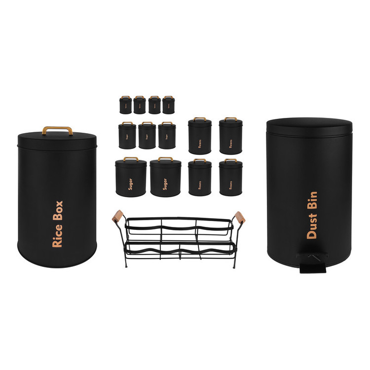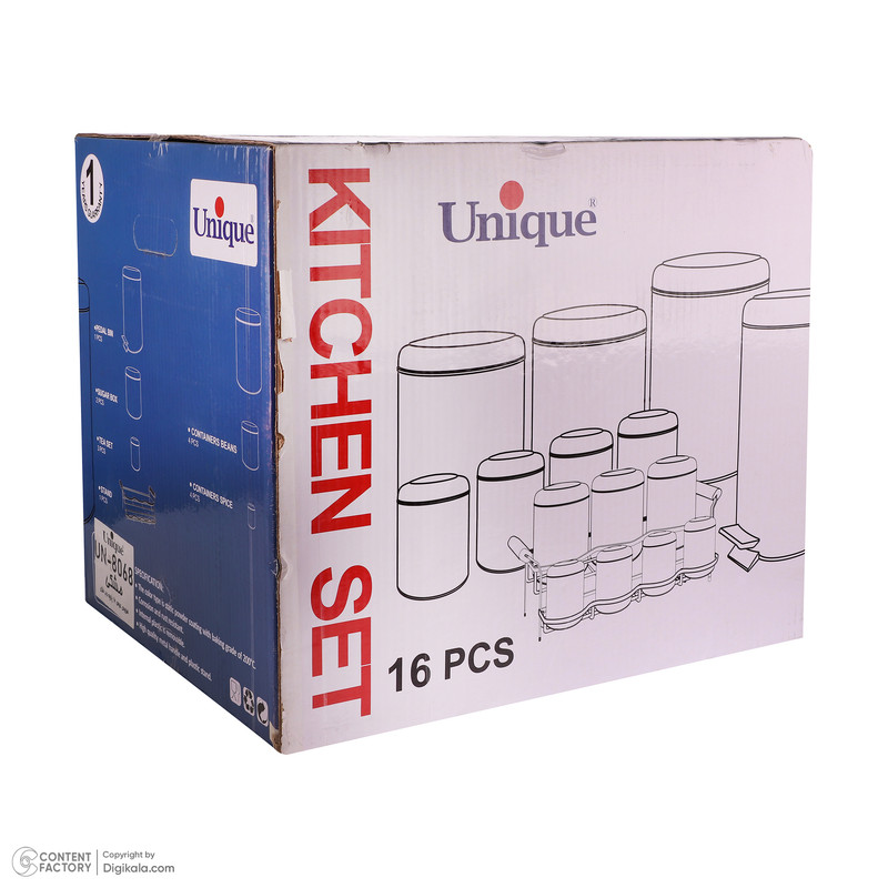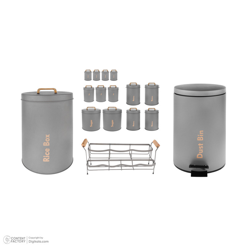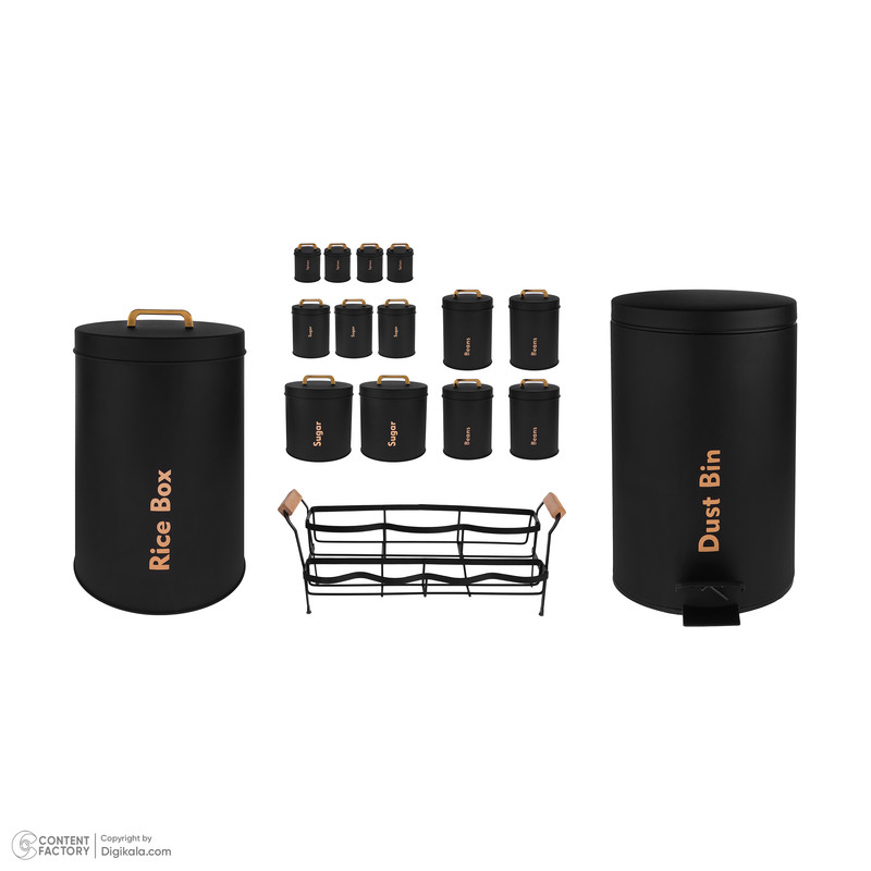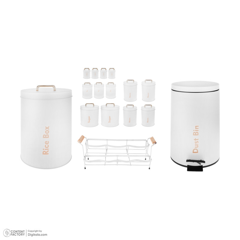 1 عدد سطل زباله - 1 عدد ظرف شکر - 1 عدد ظرف برنج - 4 عدد بانکه - 4 عدد جا ادویه ای به همراه 1 عدد استند