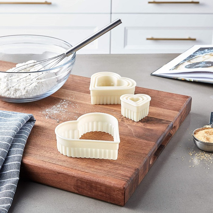 ابزار های زیادی جهت برش و فرم دهی به کیک و شیرینی وجود دارد . قالبهای برند بهگز با ایجاد اشکال متنوع ، این امکان را برایتان فراهم می آورند تا در کوتاهترین زمان ، منظم ترین اشکال را تشکیل دهید .علاوه بر کیک و انواع شیرینی از قالب برش برای بریدن خمیر فوندانت .کوکی وبیسکوییت نیز استفاده می شود. جنس آن از پلاستیک مرغوب میباشد و امکان شستشو در ماشین های ظرف شویی را دارد.این کاتر با موجودیت در 6 سایز کوچک تا بزرگ به شما این امکان را میدهد تا کوکی یا شیرینی یا تزیینات کیک خود را با تنوع و خلاقیت بیشتری برش و تزیین نمایید. کاتر قلب دو طرفه این امکان را به شما میدهد که 12 نوع کاتر در سایز و شکل مختلف داشته باشید