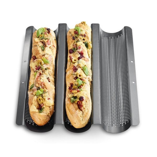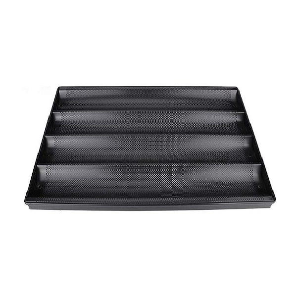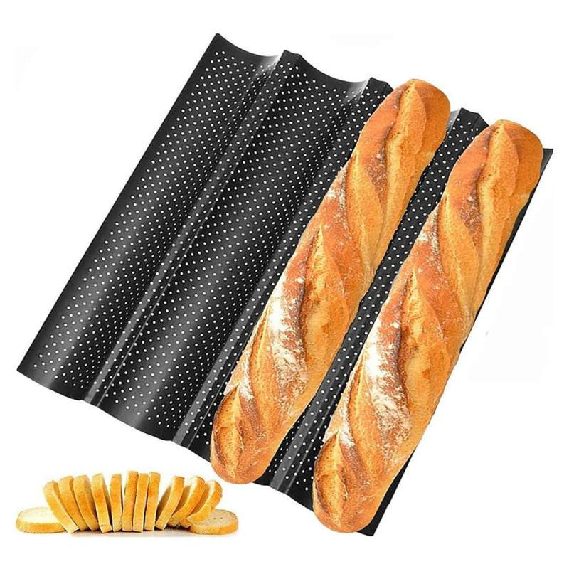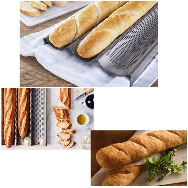 نان باگت مخصوص ساندویچ می باشد که اصولا در میان برخی از ایرانی ها به نان ساندویچ هم مشهور می باشد اما چه بهتر که اگر قرار است در منزل خودتان ساندویچ درست کنید نان آن را هم خودتان درست نمایید.سینی پخت نان باگت یکی از پرکاربردترین سینیها در صنعت پخت نان و شیرینی میباشد، این سینی جهت پخت نانهای حجیم و نیمه حجیم در فرهای مختلف قابل استفاده است.وجود سوراخهای کف قالب باعث انتقال بهتر حرارت و انتشار یکسان دما به خمیر میشود.