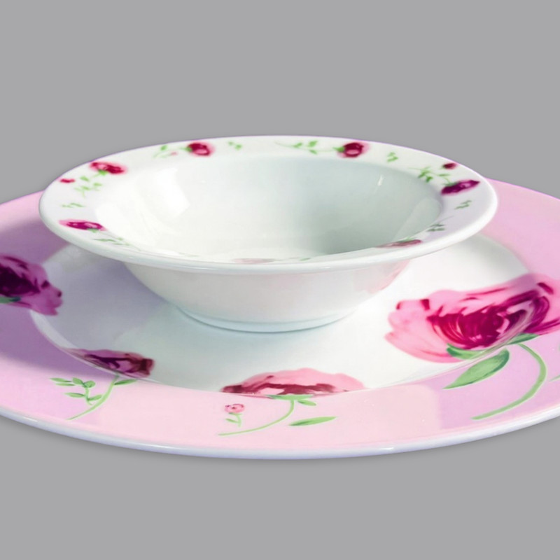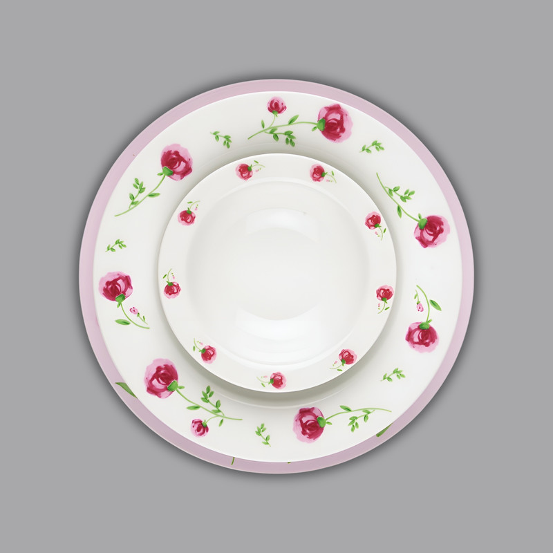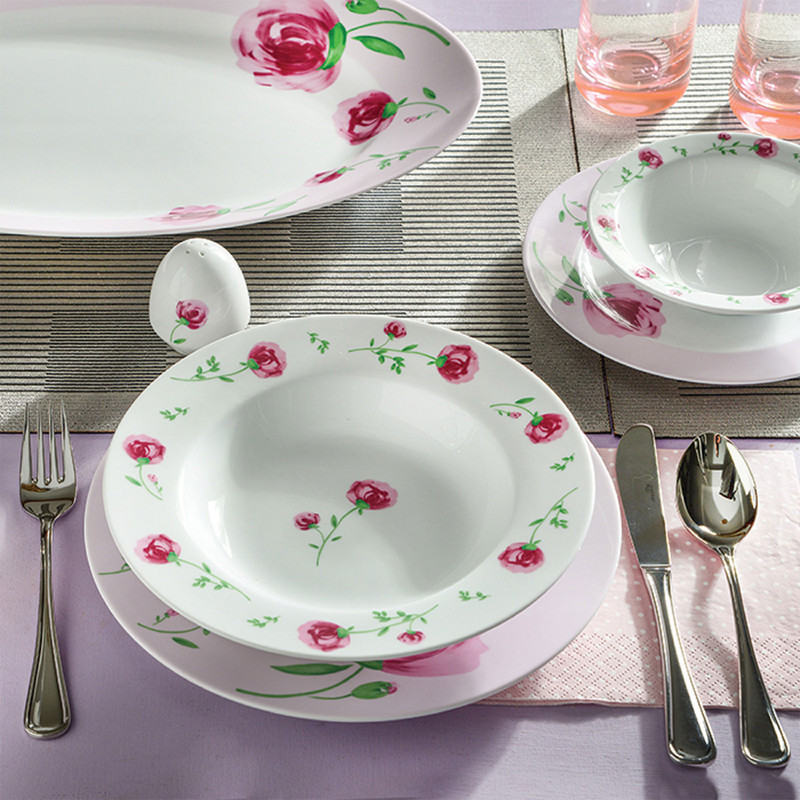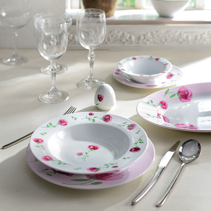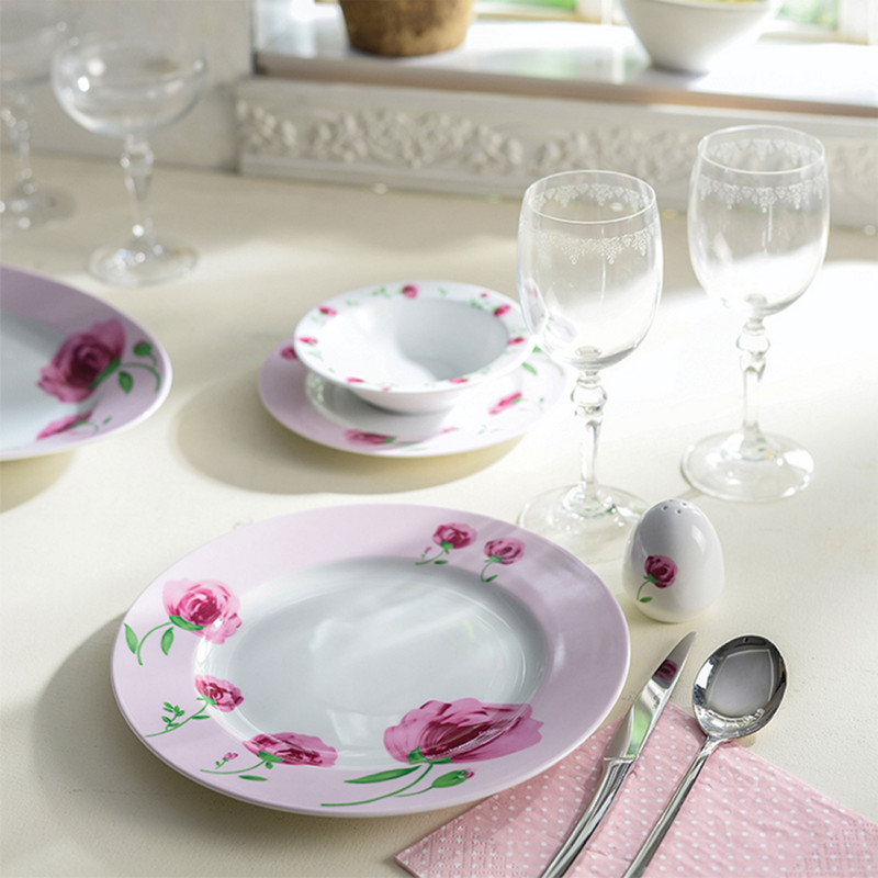 فرم دایرهای کلاسیک ظروف، در کنار طرح گل رز صورتی با ترکیب رنگی آرام و هماهنگ، فضایی گرم و لطیف برای میز غذا ایجاد میکند. این مجموعه سازگار با مایکروویو و ماشینظرفشویی است و امکان شستوشو با دست یا ماشینظرفشویی را بدون افت درخشندگی دارد.
