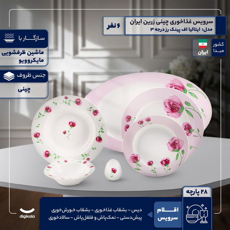 ظرافت گلهای صورتی در کنار درخشندگی لعاب شفاف، سرویس غذاخوری ۲۸ پارچه ۶ نفره چینی زرین ایران مدل ایتالیا اف پینک رز درجه ۳ را به مجموعهای دلنشین برای میزهای خانوادگی و دورهمیهای صمیمی تبدیل کرده است. این سرویس غذاخوری چینی شامل بشقابهای غذاخوری، خورشخوری و پیشدستی به همراه سالادخوری، دیس و نمکپاش و فلفلپاش است که نیازهای یک سرو کامل برای شش نفر را برطرف میکند.