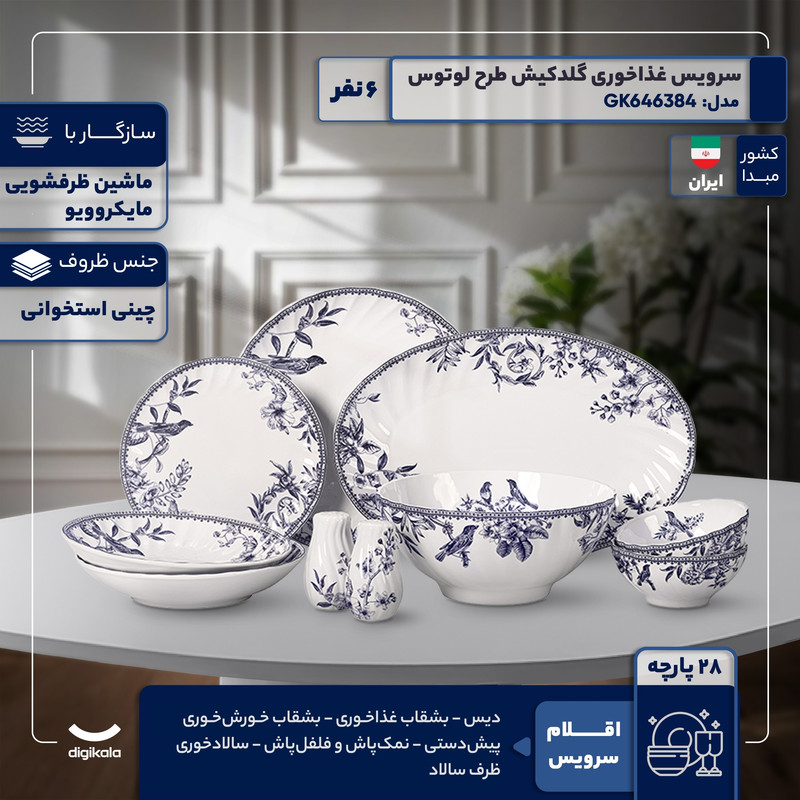 درخشش سفید چینی و طراحی لطیف در سرویس غذاخوری ۲۸ پارچه ۶ نفره گلد کیش مدل GK646384 طرح لوتوس، جلوهای آرام و دلنشین به میز پذیرایی میبخشد. این سرویس کامل غذاخوری شامل بشقابهای غذاخوری، خورشخوری و پیشدستی به همراه سالادخوری، ظرف سالاد، دیس و نمکپاش و فلفلپاش است که برای شش نفر طراحی شده و مجموعهای هماهنگ و زیبا را فراهم میکند.