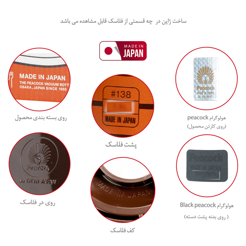 برای تحقیق درباره کیفیت این محصول بهتر است سراغ پدربزرگ و مادربزرگهایمان برویم تا از گذشته و حضور این محصول در خاطراتشان برایمان تعریف کنند. ساخت ژاپن، این کلمه ما را همیشه از کیفیت بالای یک محصول آگاه می سازد، فلاسک پیکوک نیز بیش از 70 سال است که در کشور ژاپن تولید و به بازارهای جهانی عرضه می گردد. Made in Japan در نقاط مختلف محصول حک شده و قابل روئیت می باشد. فلاسک پیش روی شما از بدنه استیل با پوشش رنگی تولید گردیده که باعث می گردد علاوه بر طول عمر بیشتر زیبایی آن را دوچندان نماید. مخزن این فلاسک از با کیفیت ترین شیشه کشور ژاپن ساخته شده است . فلاسک دارای مخزن شیشه ای از نظر بهداشتی عملکرد بهتر و دما را تا مدت زمان بیشتری نگه می دارد. همچنین علاوه بر نقش مهمی که در ماندگاری دمای نوشیدنی های گرم دارد، به سادگی تمیز می شود به علاوه میزان لکه پذیری کمتری دارند و در زمان مواجهه با مایعات در دما مختلف واکنش منفی از خود نشان نمی دهند. این عایق بو را جذب نمی کند و وزن کمتری نسبت به دیگر عایق ها دارد. این محصول در سایز های 1 – 1.3 – 1.6 – 1.9 لیتر تولید و عرضه می گردد. برای اطمینان از خرید محصول اصلی به هولوگرام روی بسته بندی و هولوگرام مشکی رنگ پشت دسته فلاسک که هر دو دارای شماره سریال 8 رقمی می باشد توجه فرمایید.