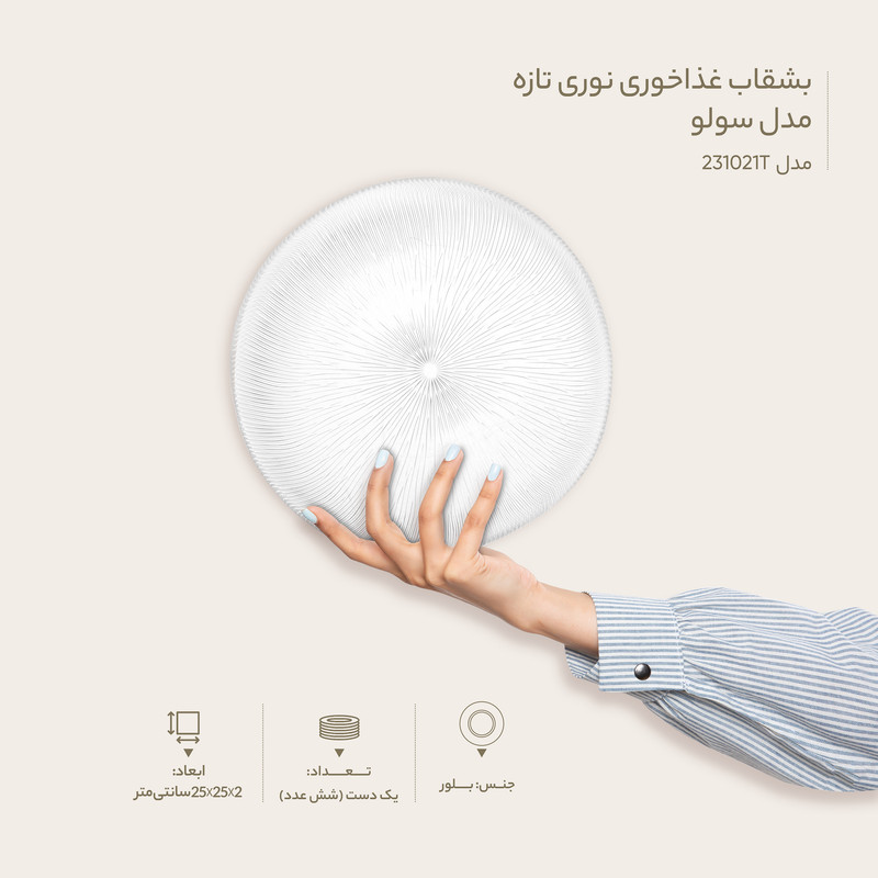 بشقاب غذا خوری نوری تازه سری SOLO مدل 231021T در ابعاد مناسب طراحی شده و وجود سطح گود، آن را برای سرو انواع پلو و غذا مناسب ساخته است. طراحی و نقوش روی این بشقاب دایرهای شکلی نظر هر فردی را به خود جلب میکند. بدنه بشقاب از جنس بلور و با دقت بالا ساخته شده که در نتیجه وزن آن نسبت به نمونه های مشابه سبکتر و حمل آن برای ما آسانتر است. ناگفته نماند که در ساخت این ظرف بلوری دقت فراوانی صورت گرفته است. استفاده از ظروف بلوری در مقایسه با سایر ظروف آسیبی به بدن ما وارد نمیکند، بعضی از ظروف با توجه به استفاده از سرب در زمان سرو مواد غذایی ممکن است در طولانی مدت، برای سلامتی مضر باشد. چرا که مواد سمی میتواند به مواد خوراکی منتقل شده و وارد بدن شود. بشقاب خورش خوری نوری تازه سری SOLO مدل 231021T کالایی زیبا در اختیار ما قرار میدهد. سرو انواع خورش و حتی سوپ در این نوع ظرف شیک و مجلل با وجود زیبایی که دارد، خاطرهی دلچسب از یک میزبانی را برایمان ماندگار میکند و برای سالیان طولانی در ذهن ما حک میشود.