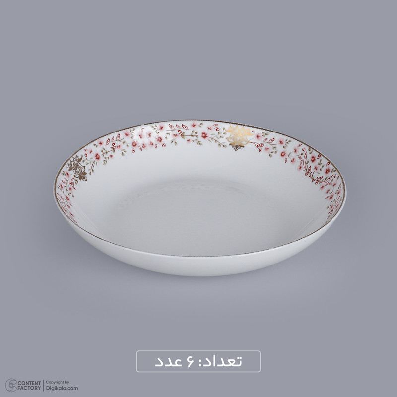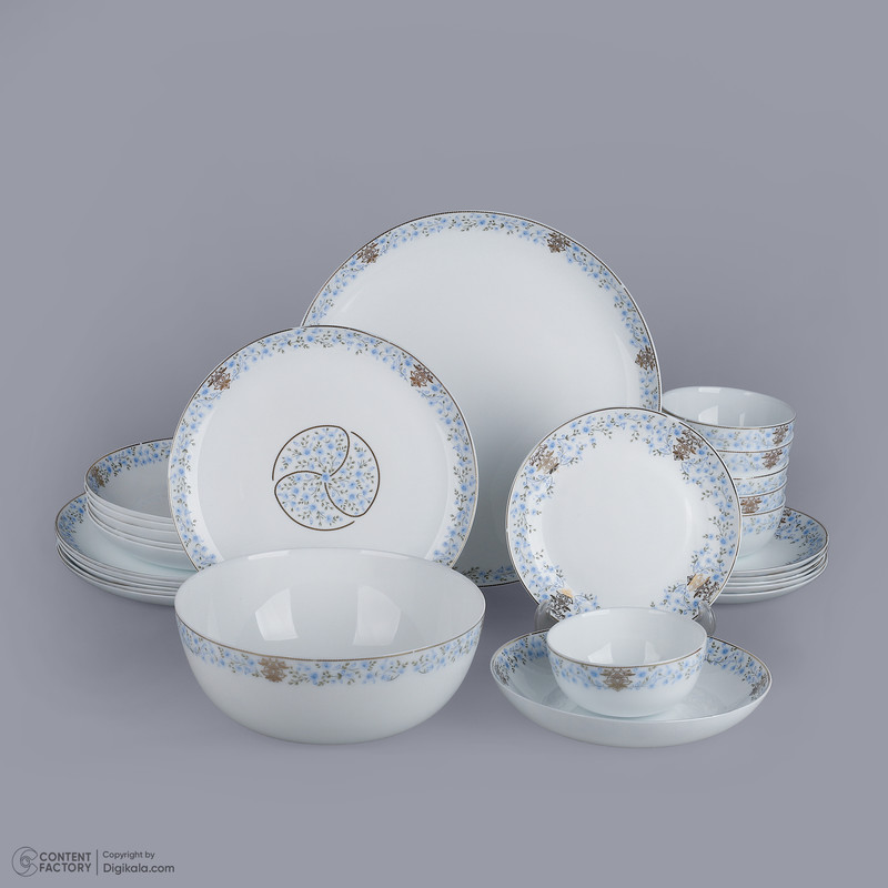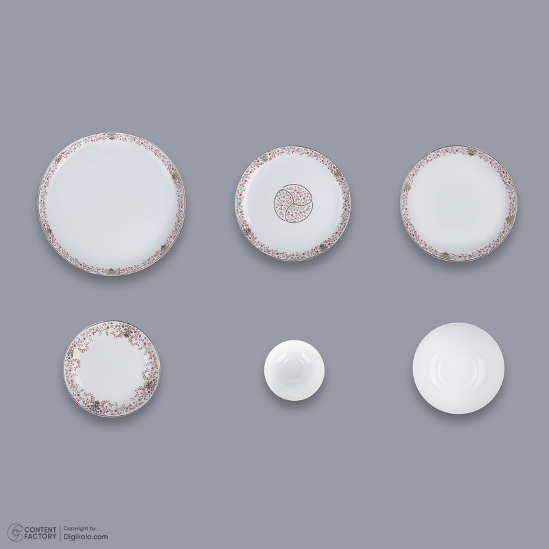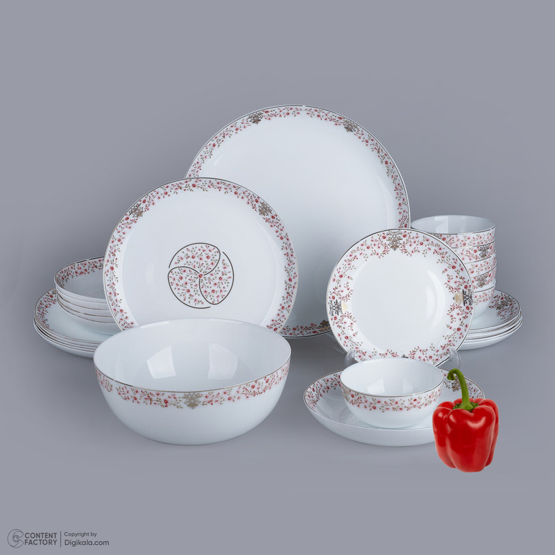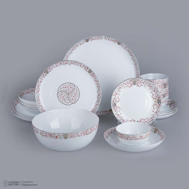 این مجموعه از نظر اقلام سرویس کاملاً جامع است و تمامی نیازهای یک وعده غذایی را پوشش میدهد. اقلام سرویس شامل بشقاب غذاخوری، بشقاب خورشخوری، پیشدستی، پیاله، دیس و ظرف سالاد است. این تنوع ظروف، چیدمان میز را برای سرو غذاهای مختلف آسان میکند.