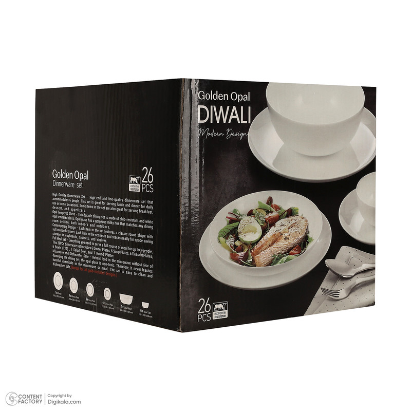 این سرویس غذاخوری ۲۶ پارچه از برند گلدن اوپال یک مجموعه کامل برای پذیرایی از ۶ نفر است که در کشور مبدأ ایران تولید شده است. جنس ظروف اوپال بوده که به دلیل سبکی، شفافیت و مقاومت بالا، انتخابی ایدهآل برای استفاده روزمره و میزبانی به شمار میآید.
