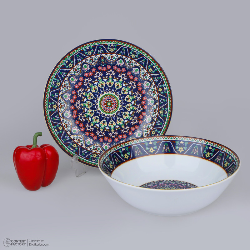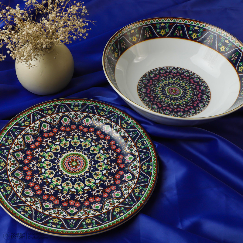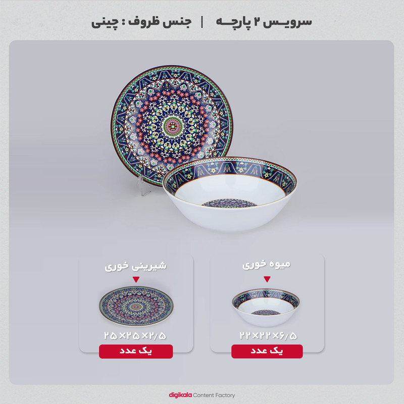 سرویس پذیرایی 2 پارچه مقصود مدل ترنج از تولیدات زیبای گروه کارخانهجات چینی مقصود است. این برند یکی از معتبرترین برندهای داخلی در زمینه تولید ظروف چینی محسوب میشود. استفاده از مواد اولیه باکیفیت در تولید محصولات چینی مقصود موجب شده که سرویس پذیرایی ترنج از دوام بالایی برخوردار باشد و بتوان برای مدت طولانی از آن استفاده نمود. این سرویس پذیرایی از 2 قطعه ظرف شامل یک عدد ظرف میوهخوری با ابعاد 6.5×22×22 سانتیمتر و وزن 460 گرم و یک عدد ظرف شیرینیخوری با ابعاد 2.5×25×25 سانتیمتر و وزن 685 گرم تشکیل شده است. تمیز نمودن این محصول آسان بوده و برای شستشوی ظروف سرویس پذیرایی میتوان از روش شستشو با دست و یا شستشو در ماشین ظرفشویی استفاده کرد. در طراحی سرویس پذیرایی 2 پارچه مقصود مدل ترنج از طرح و نقوش زیبای سنتی بهره برده شده است و این سرویس زیبا با نام ترنج در دو رنگ قرمز و سورمهای به بازار عرضه میشود. زیبایی طرح و رنگ به کار رفته در این ظروف باعث میشود که با فضای پذیرایی شما کاملا متناسب باشد و جلوه خاصی به آن ببخشد. همچنین این محصول در برابر لبپریدگی و شکستگی مقاومت خوبی دارد.