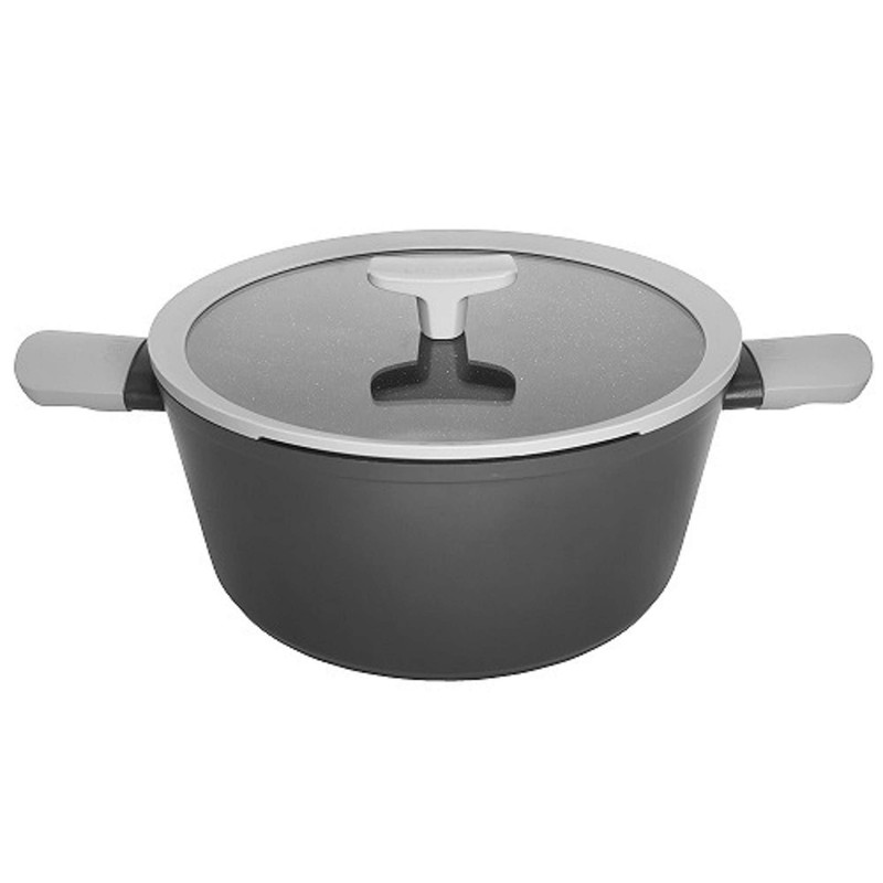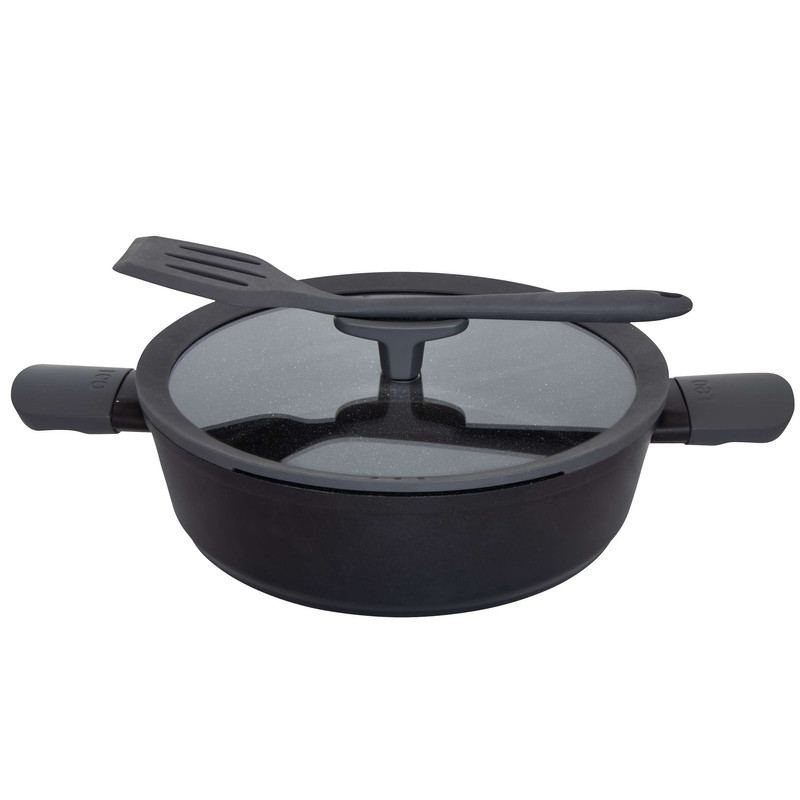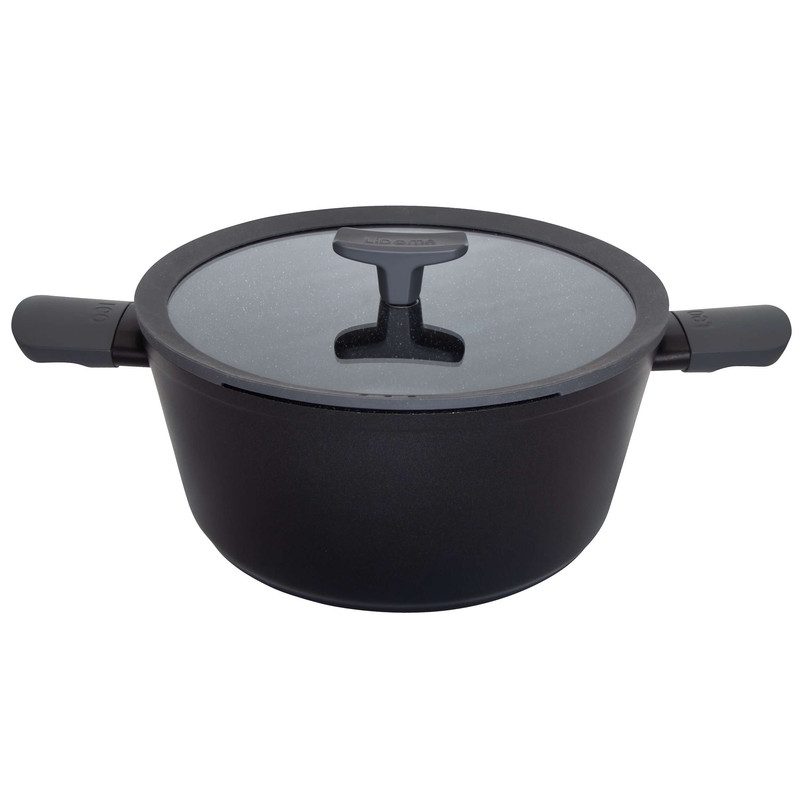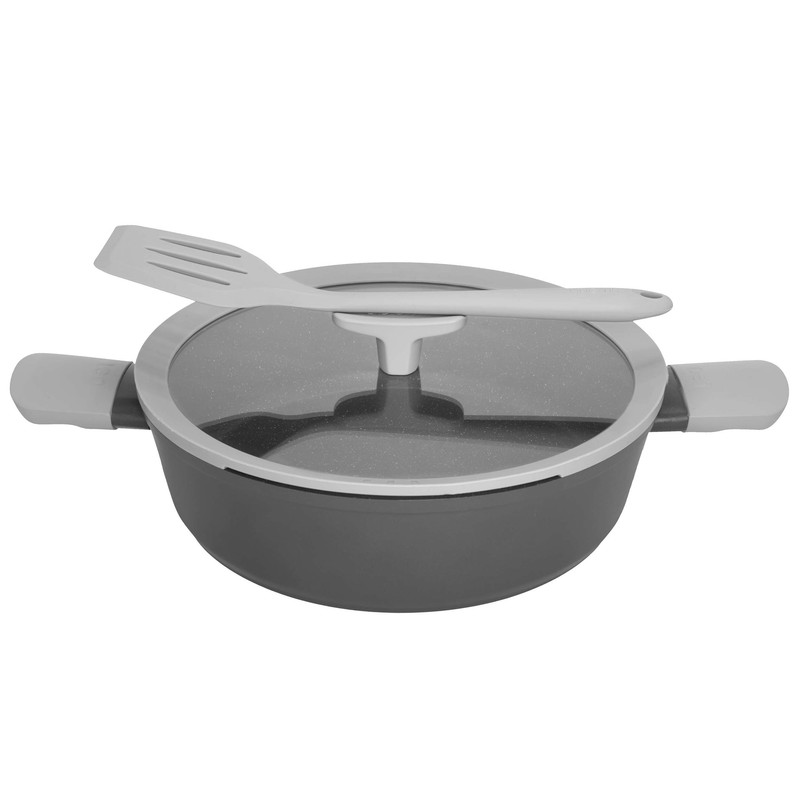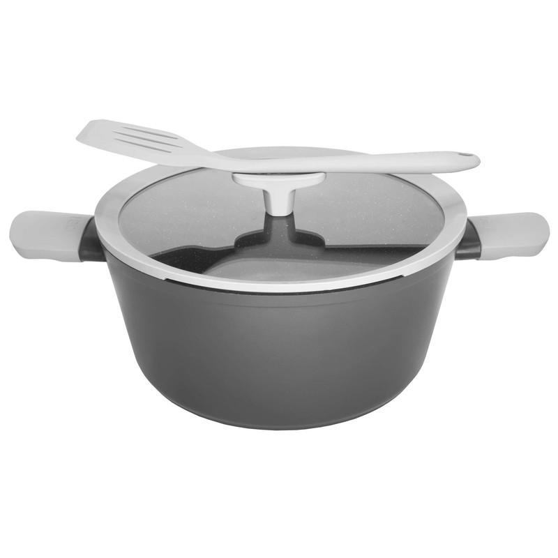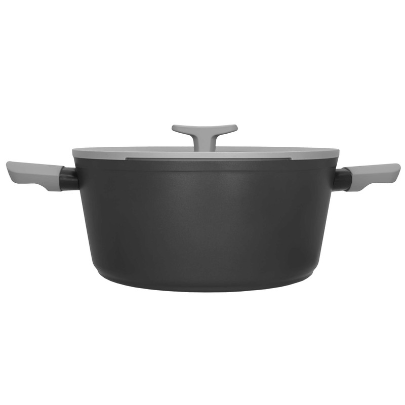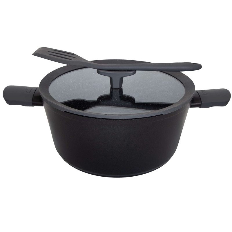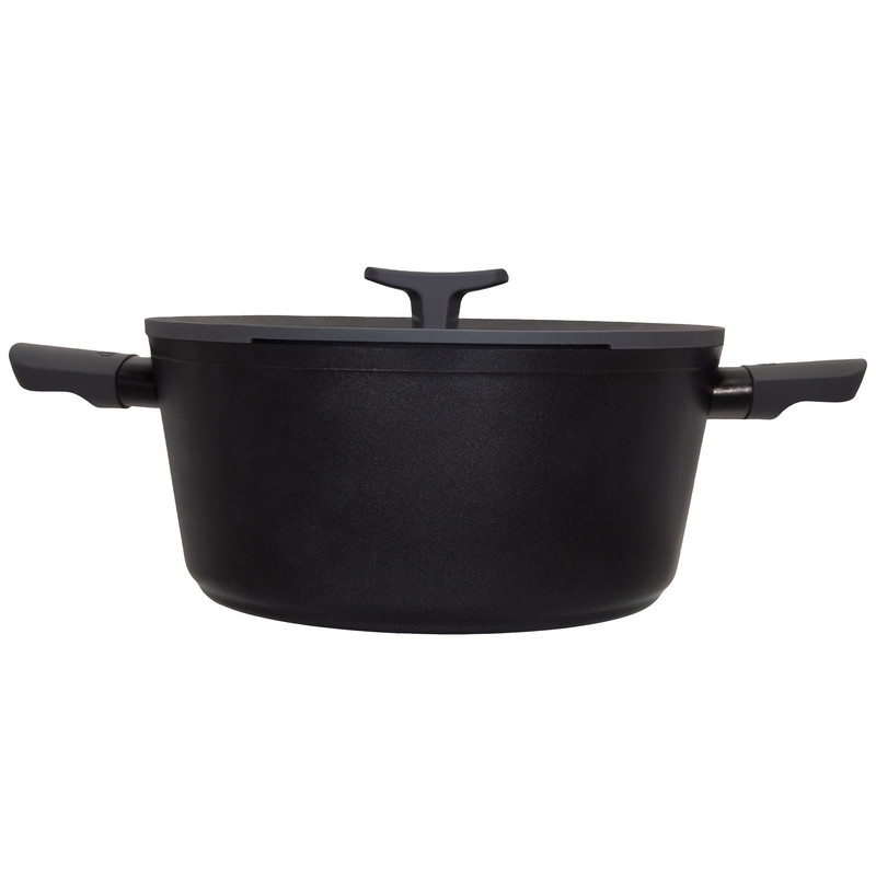 درب سیلیکونی با شیشهی تمپرد نشکن، امکان خروج بخار بهصورت کنترلشده از حاشیهی سیلیکونی را فراهم میکند و قابلیت آبکش کردن از طریق درب نیز دارد. دستههای باکالیت سافتتاچ در برابر حرارت مقاوم بوده و جابجایی ظروف را آسان میکنند. قپهی ویژهی طراحیشده روی درب نیز محلی برای قرار دادن کفگیر و ملاقه دارد و از جنس باکالیت نسوز است. کف قابلمه اطلاعاتی مانند ابعاد و حجم را در خود دارد و طراحی ضدلغزش آن مانع حرکت ظرف روی سطح اجاق میشود.
