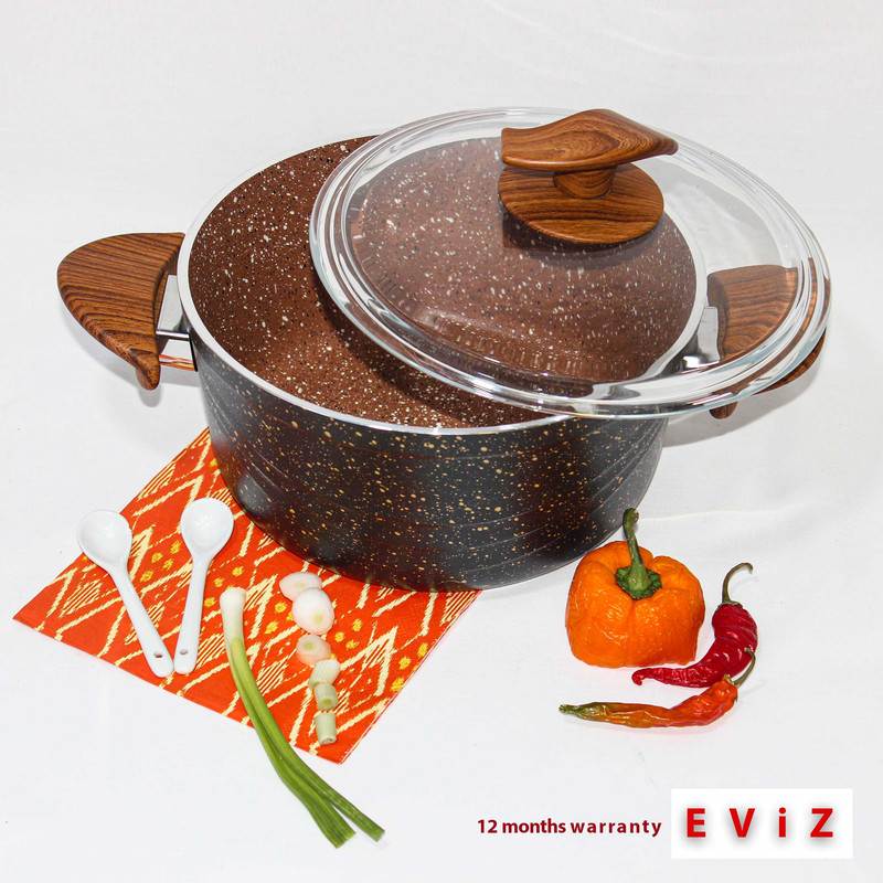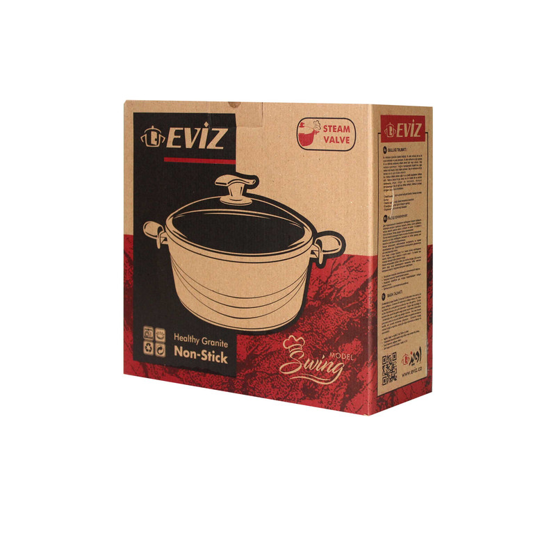 قابلمه پخت و پز اِویز از نظر کیفیت در سطح مطلوبی قرار دارد و انتخاب مناسبی برای طبخ غذاهای مختلف بهحساب میآید. دستههایی از جنس باکالیت و درپوشهایی از جنس شیشهای پیرکس دارد. نکته مهم که این قابلمه را نسبت به سایر ظروف متمایز میکند عدم وجود زوار استیل یا فلزی در دور درب ظرف می باشد که به جهت حفظ بهداشت و عدم تجمع میکروب در سطح بسیار مهم و حایز اهمیت می باشد. ظروف آشپزی اِویز به روش فورج و از آلیاژ ویژه با بکارگیری تکنولوژی روز دنیا برای اولین بار در ایران تولید میگردند، پوشش نچسب گرانیتی آلمانی به کار رفته در این سرویس ها از بهترین مواد اولیه استفاده شده است. بهداشتی بودن لبه درب تمام شیشه، سوپاپ اطمینان و تعبیه سه برجستگی در لبههای پیرکس جهت خروج بخار، دارا بودن نشان استاندارد Bio آلمان به عنوان تضمین حفاظت از محیطزیست، استحکام و سختی بسیار بالای محصول و عدم شکنندگی از سایر ویژگی های این محصول می باشد. همانطور که در بالا اشاره شد جنس دسته و همچنین قپه درپوش باکالیت بوده که از مقاومت بالایی دربرابر حرارت برخوردارند. کفهی بیرونی ظروف هم ضدخش طراحی شده است و در صورت استفاده روی انواع اجاقگاز، آسیبی متوجه آنها نخواهد بود. برای طول عمر بالای ظروف گرانیتی بهتر است از ماشین ظرفشویی به هیچ عنوان استفاده نکنید و فقط با یک تکه اسفنج نرم و مایع شویندهی ملایم آن را بشویید.