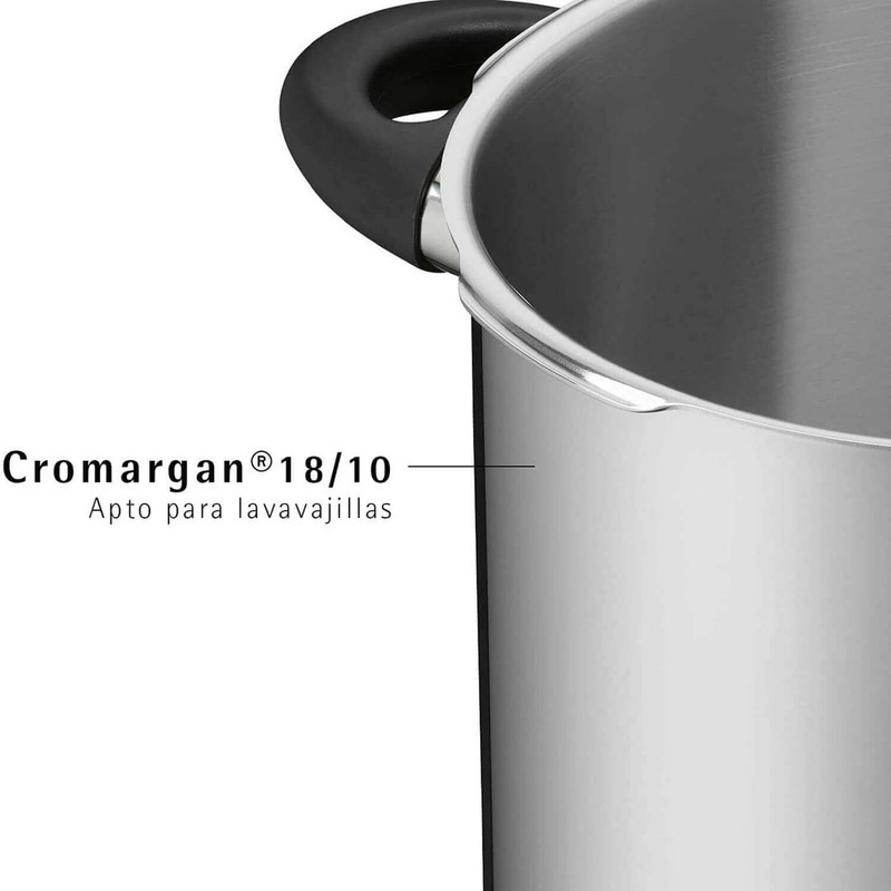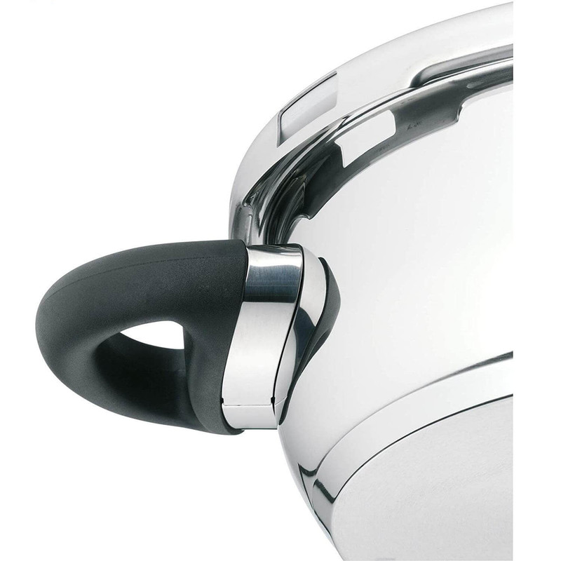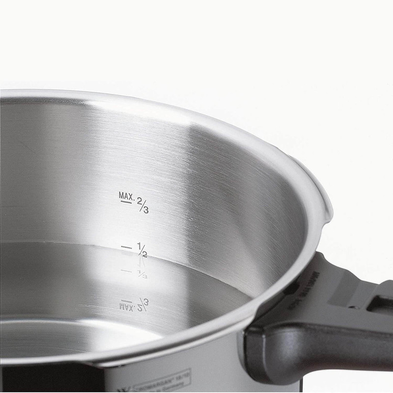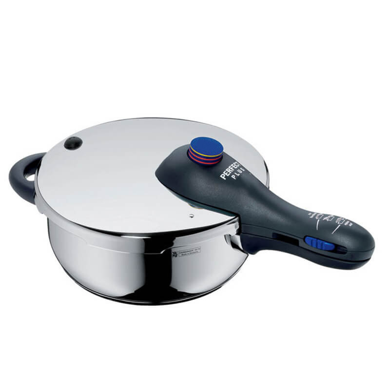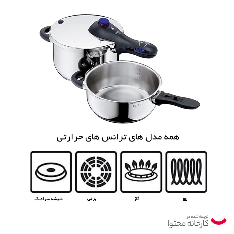 زودپز دوقلو WMF مدل Schnellkochtopf-Set 3-teilig Perfect Plus, 3L-4,5 L خروج خودکار بخار و ایمنی فشار باقی مانده برای باز شدن درب را فراهم می کند . این سرویس شامل یک زودپز 3 لیتر و یک زودپز 4.5 لیتر و یک دسته همراه درب مشترک می باشد که داخل زودپز مقیاس اندازه گیری درج شده است تا آشپزی را راحت کند . نشانگر سازگاری با 2 کد رنگی برای تنظیم پخت و پز (110 درجه سانتیگراد/119 درجه سانتی گراد) . دسته درب قابل جدا شدن جهت نظافت ساده است . جنس فولاد ضد زنگ Cromargan ضد زنگ 18/10 قابل شستشو در ماشین ظرفشویی ، تمیز کردن آسان ، ایمن در فر ، بی مزه ( مزه غذا در این قابلمه ها تغییر نمی کند ) و مقاوم در برابر اسید می باشد . تهیه غذا در زودپز مدرن ، سریع و سالم است . فشار شدید و دمای بالا ، زمان پخت معمولی را تا 70 درصد کوتاه می کند . با صرفه جویی همزمان انرژی در حدود 50 درصد از ویتامین ها ، مواد مغذی و مواد معدنی تا حد زیادی با پخت ملایم حفظ می شوند و غذاها مقوی و خوشمزه هستند . قابلمه های پرسرعت تقریباً برای تهیه همه غذاها و سبزیجات ، گوشت و ماهی ، غلات و حبوبات ، سوپ ها و خورش ها مناسب هستند . طراحی کلاسیک آن جاودانه است و عملکرد آن همیشه با جدیدترین فناوری مطابقت دارد .
