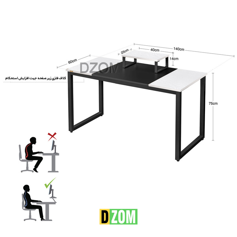 میز کامپیوتر دیزم DZom مدل CD_LI100_140_BAW محصولی سبک، شیک و در عین حال جذاب و کارآمد از سری تولیدات دیزم است. این محصول از رنگ رویه الکترواستاتیک با ماندگاری و دوام بالا ساخته شده است. همچنین پایه های پیچی، قابلیت تنظیم نسبت به سطح زمین را دارد تا بهترین تراز جهت جلوگیری از تکان خوردن را ایجاد نماید. صفحه محصول از جنس MDF درجه یک برجسته طرح چوب با ترکیبی از دو رنگ مشکی و سفید است. این محصول با طول 140cm، عرض 60cm و ارتفاع 75cm عرضه میشود. به این نکته توجه شود که تنوع رنگ انتخابی کالا تنها مربوط به رنگ پایه های فلزی است.