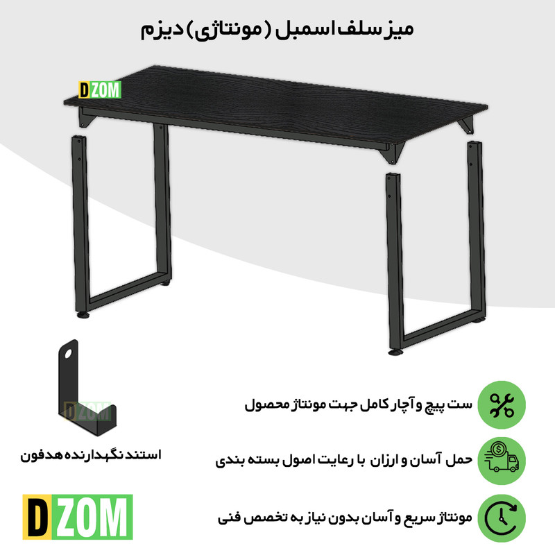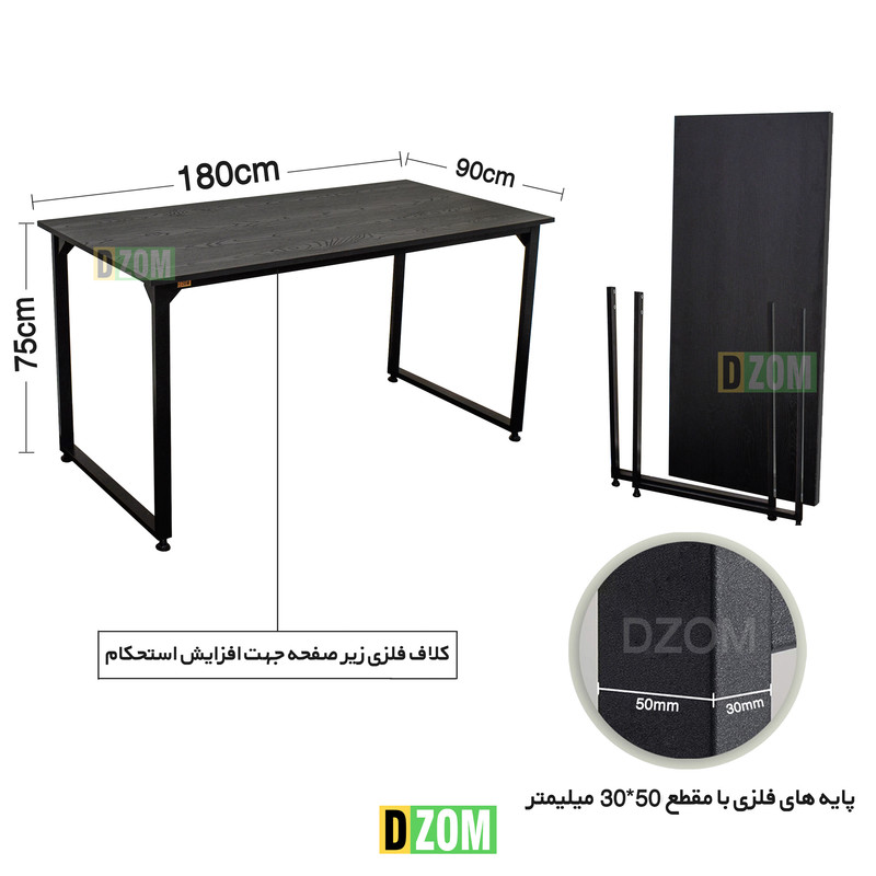 میز جلسه دیزم DZom مدل مونتاژی TLD_asm_180×90_B محصولی مونتاژی، سبک، شیک و در عین حال جذاب و کارآمد از سری تولیدات دیزم میباشد. این محصول بصورت سلف اسمبل (مونتاژی) تولید شده است. این میز حمل و نقل آسان و هزینه حمل مقرون به صرفه ای دارد. این میز از پایه های فلزی با مقطع 50x30 میلیمتر و رنگ رویه الکترواستاتیک با ماندگاری و دوام بالا ساخته شده است. همچنین پایه های پیچی، قابلیت تنظیم نسبت به سطح زمین را دارد تا بهترین تراز جهت جلوگیری از تکان خوردن را ایجاد نماید. صفحه میز از جنس MDF درجه یک برجسته طرح چوب و به رنگ مشکی می باشد. این محصول با طول 180cm، عرض 90cm و ارتفاع 75cm عرضه می شود. به این نکته توجه شود که تنوع رنگ انتخابی کالا تنها مربوط به رنگ پایه های فلزی میباشد.