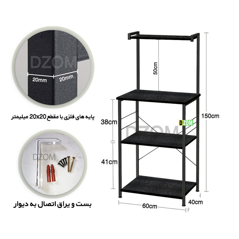 کافی بار اداری دیزم DZom مدل OF_F100_60_B محصولی سبک، شیک و در عین حال جذاب و کارآمد از سری تولیدات دیزم میباشد. این محصول از پایه های فلزی با مقطع 20x20 میلیمتر و رنگ رویه الکترواستاتیک با ماندگاری و دوام بالا ساخته شده است. همچنین پایه های پیچی، قابلیت تنظیم نسبت به سطح زمین را دارد تا بهترین تراز جهت جلوگیری از تکان خوردن را ایجاد نماید. صفحه محصول از جنس MDF درجه یک برجسته طرح چوب به رنگ مشکی می باشد. این محصول با طول 60cm، عرض 40cm و ارتفاع 150cm عرضه می شود. به این نکته توجه شود که تنوع رنگ انتخابی کالا تنها مربوط به رنگ پایه های فلزی میباشد و محصول به صورت کاملا مونتاژ شده و آماده استفاده برای مشتریان ارسال می گردد. توصیه میشود جهت حفظ ایمنی و ثبات بیشتر، محصول در یک یا دو نقطه به دیوار پیچ گرد.(یراق اتصال داخل بسته بندی موجود است).