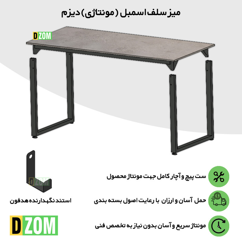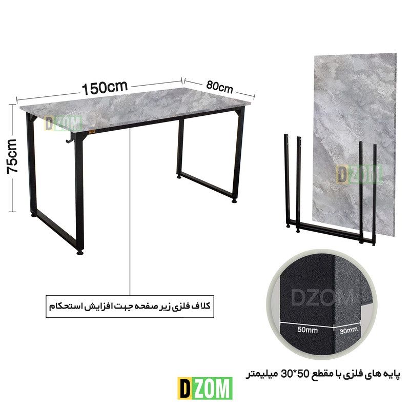 میز اداری دیزم DZom مدل مونتاژی TLD_asm_150×80_GR محصولی مونتاژی، سبک، شیک و در عین حال جذاب و کارآمد از سری تولیدات دیزم میباشد. این محصول بصورت سلف اسمبل (مونتاژی) تولید شده است. این میز حمل و نقل آسان و هزینه حمل مقرون به صرفه ای دارد. این میز از پایه های فلزی با مقطع 50x30 میلیمتر و رنگ رویه الکترواستاتیک با ماندگاری و دوام بالا ساخته شده است. همچنین پایه های پیچی، قابلیت تنظیم نسبت به سطح زمین را دارد تا بهترین تراز جهت جلوگیری از تکان خوردن را ایجاد نماید. صفحه میز از جنس MDF درجه یک به رنگ طوسی می باشد. این محصول با طول 150cm، عرض 80cm و ارتفاع 75cm عرضه می شود. به این نکته توجه شود که تنوع رنگ انتخابی کالا تنها مربوط به رنگ پایه های فلزی میباشد.