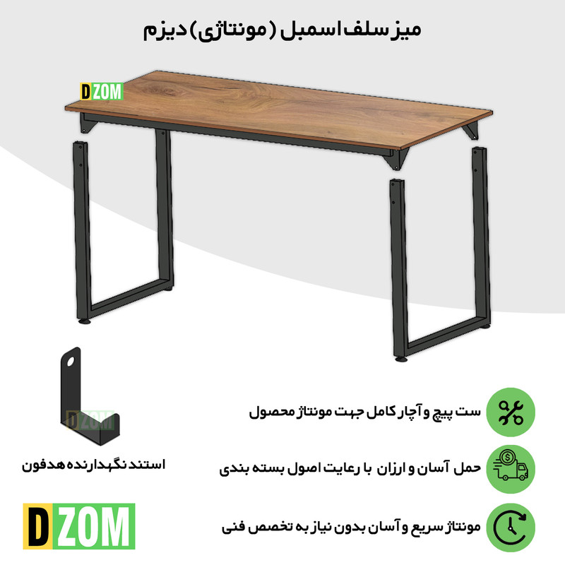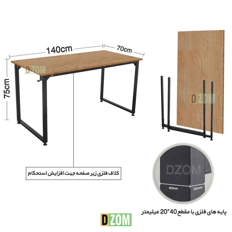 میز اداری دیزم DZom مدل مونتاژی TLD_asm_140×70_LIGHT محصولی مونتاژی، سبک، شیک و در عین حال جذاب و کارآمد از سری تولیدات دیزم میباشد. این محصول بصورت سلف اسمبل (مونتاژی) تولید شده است. ویژگی ممتاز این میز حمل و نقل آسان آن است. سلف اسمبل بودن محصول باعث شده است تا هزینه حمل و نقل آن بسیار مناسب و مقرون به صرفه شود. این میز از پایه های فلزی با مقطع 40x20 میلیمتر و رنگ رویه الکترواستاتیک با ماندگاری و دوام بالا ساخته شده است. همچنین پایه های پیچی، قابلیت تنظیم نسبت به سطح زمین را دارد تا بهترین تراز جهت جلوگیری از تکان خوردن را ایجاد نماید. صفحه میز از جنس MDF درجه یک برجسته طرح چوب به رنگ قهوه ای روشن می باشد. این محصول با طول 140cm، عرض 70cm و ارتفاع 75cm عرضه می شود. به این نکته توجه شود که تنوع رنگ انتخابی کالا تنها مربوط به رنگ پایه های فلزی میباشد.
