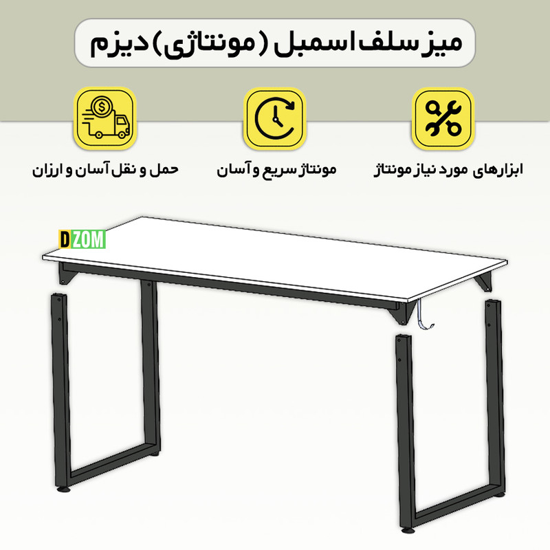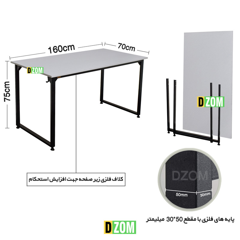 میز اداری دیزم DZom مدل مونتاژی TLD_asm_160×70_W محصولی مونتاژی، سبک، شیک و در عین حال جذاب و کارآمد از سری تولیدات دیزم میباشد. این محصول بصورت سلف اسمبل (مونتاژی) تولید شده است. این میز حمل و نقل آسان و هزینه حمل مقرون به صرفه ای دارد. این میز از پایه های فلزی با مقطع 50x30 میلیمتر و رنگ رویه الکترواستاتیک با ماندگاری و دوام بالا ساخته شده است. همچنین پایه های پیچی، قابلیت تنظیم نسبت به سطح زمین را دارد تا بهترین تراز جهت جلوگیری از تکان خوردن را ایجاد نماید. صفحه میز از جنس MDF درجه یک برجسته طرح چوب به رنگ سفید می باشد. این محصول با طول 160cm، عرض 70cm و ارتفاع 75cm عرضه می شود. به این نکته توجه شود که تنوع رنگ انتخابی کالا تنها مربوط به رنگ پایه های فلزی میباشد.