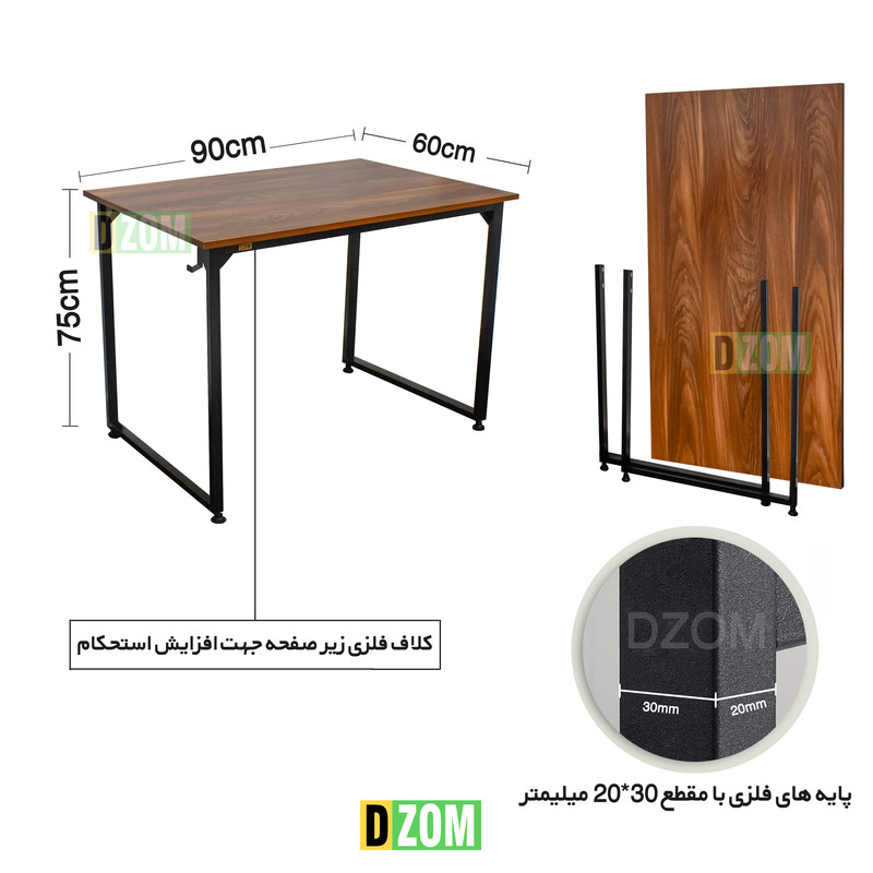 میز لپ تاپ دیزم DZom مدل مونتاژی TLD_asm_90×60_BRN محصولی مونتاژی، سبک، شیک و در عین حال جذاب و کارآمد از سری تولیدات دیزم میباشد. این محصول بصورت سلف اسمبل (مونتاژی) تولید شده است. این میز حمل و نقل آسان و هزینه حمل مقرون به صرفه ای دارد. این میز از پایه های فلزی با مقطع 30x20 میلیمتر و رنگ رویه الکترواستاتیک با ماندگاری و دوام بالا ساخته شده است. همچنین پایه های پیچی، قابلیت تنظیم نسبت به سطح زمین را دارد تا بهترین تراز جهت جلوگیری از تکان خوردن را ایجاد نماید. صفحه میز از جنس MDF درجه یک برجسته طرح چوب و به رنگ قهوه ای می باشد. این محصول با طول 90cm، عرض 60cm و ارتفاع 75cm عرضه می شود. به این نکته توجه شود که تنوع رنگ انتخابی کالا تنها مربوط به رنگ پایه های فلزی میباشد.