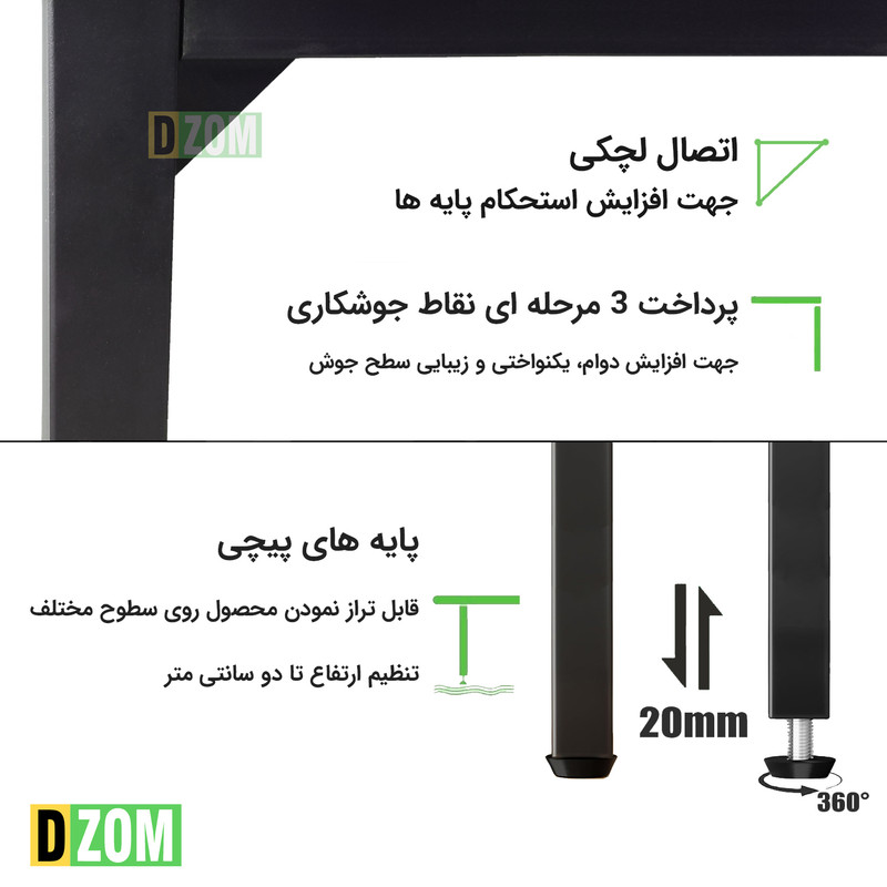 میز مدیریت دیزم DZom مدل مونتاژی TLD_asm_150×70_Tri_BALIGHT محصولی مونتاژی، سبک، شیک و در عین حال جذاب و کارآمد از سری تولیدات دیزم میباشد. این محصول بصورت سلف اسمبل (مونتاژی) تولید شده است. این میز حمل و نقل آسان و هزینه حمل مقرون به صرفه ای دارد. این میز از پایه های فلزی با مقطع 50x30 میلیمتر و رنگ رویه الکترواستاتیک با ماندگاری و دوام بالا ساخته شده است. همچنین پایه های پیچی، قابلیت تنظیم نسبت به سطح زمین را دارد تا بهترین تراز جهت جلوگیری از تکان خوردن را ایجاد نماید. صفحه میز از جنس MDF درجه یک برجسته طرح چوب با ترکیبی از دو رنگ مشکی و قهوهای روشن می باشد. این محصول با طول 150cm، عرض 70cm و ارتفاع 75cm عرضه می شود. به این نکته توجه شود که تنوع رنگ انتخابی کالا تنها مربوط به رنگ پایه های فلزی میباشد.