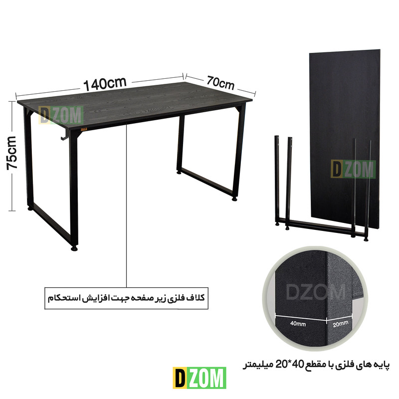 میز اداری دیزم DZom مدل مونتاژی TLD_asm_140×70_B محصولی مونتاژی، سبک، شیک و در عین حال جذاب و کارآمد از سری تولیدات دیزم میباشد. این محصول بصورت سلف اسمبل (مونتاژی) تولید شده است. ویژگی ممتاز این میز حمل و نقل آسان آن است. سلف اسمبل بودن محصول باعث شده است تا هزینه حمل و نقل بسیار مناسب و مقرون به صرفه شود. این میز از پایه های فلزی با مقطع 40x20 میلیمتر و رنگ رویه الکترواستاتیک با ماندگاری و دوام بالا ساخته شده است. همچنین پایه های پیچی، قابلیت تنظیم نسبت به سطح زمین را دارد تا بهترین تراز جهت جلوگیری از تکان خوردن را ایجاد نماید. صفحه میز از جنس MDF درجه یک برجسته طرح چوب به رنگ مشکی می باشد. این محصول با طول 140cm، عرض 70cm و ارتفاع 75cm عرضه می شود. به این نکته توجه شود که تنوع رنگ انتخابی کالا تنها مربوط به رنگ پایه های فلزی میباشد.