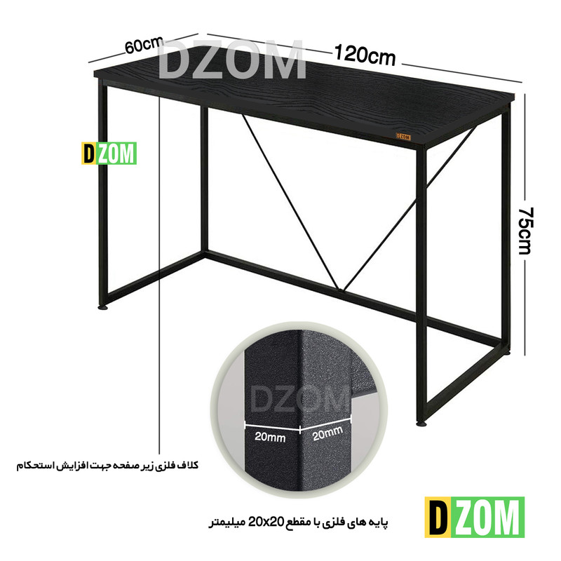 میز دیزم DZom مدل CD-46C50-120B محصولی سبک، شیک و در عین حال جذاب و کارآمد از سری تولیدات دیزم میباشد. این محصول از پایه های فلزی با مقطع 20x20 میلیمتر و رنگ رویه الکترواستاتیک با ماندگاری و دوام بالا ساخته شده است. همچنین پایه های پیچی، قابلیت تنظیم نسبت به سطح زمین را دارد تا بهترین تراز جهت جلوگیری از تکان خوردن را ایجاد نماید. صفحه محصول از جنس MDF درجه یک برجسته طرح چوب و به رنگ مشکی می باشد. این محصول با طول 120cm، عرض 60cm و ارتفاع 75cm عرضه می شود. به این نکته توجه شود که تنوع رنگ انتخابی کالا تنها مربوط به رنگ پایه های فلزی میباشد و محصول به صورت کاملا مونتاژ شده و آماده استفاده برای مشتریان ارسال می گردد.