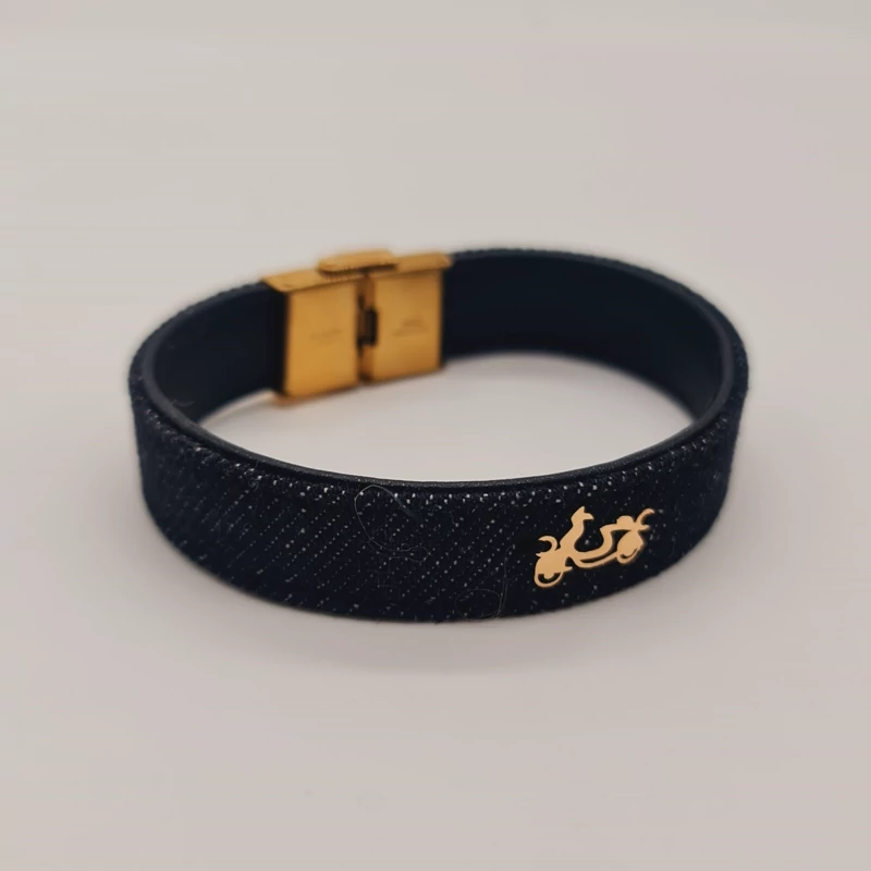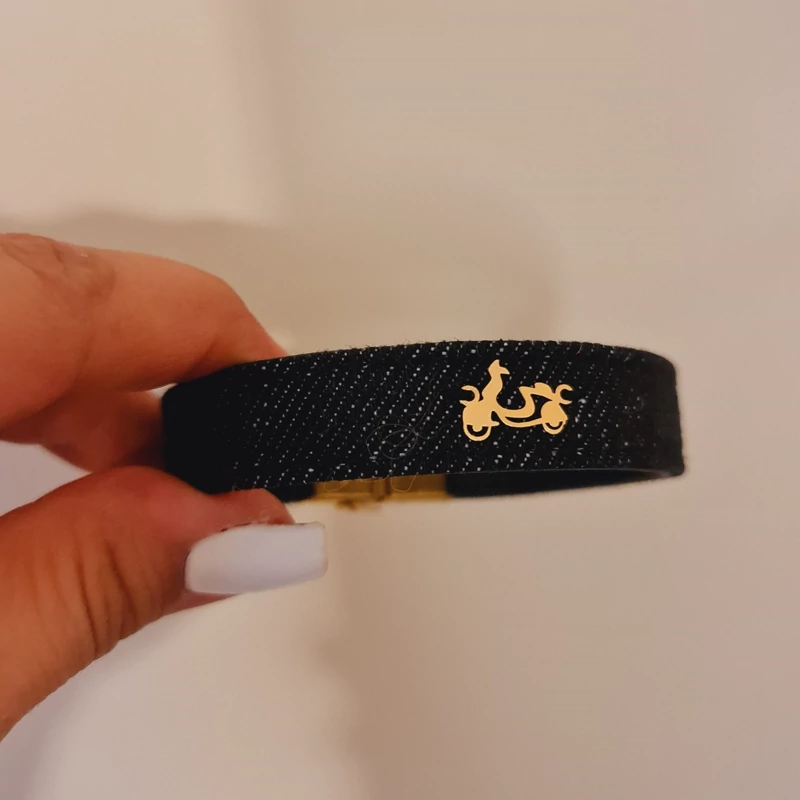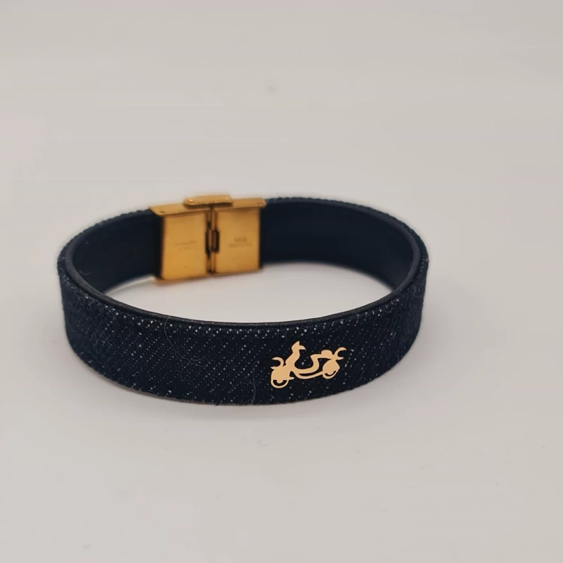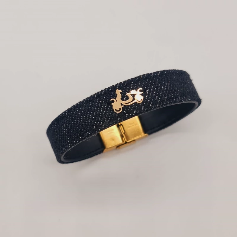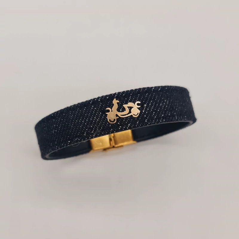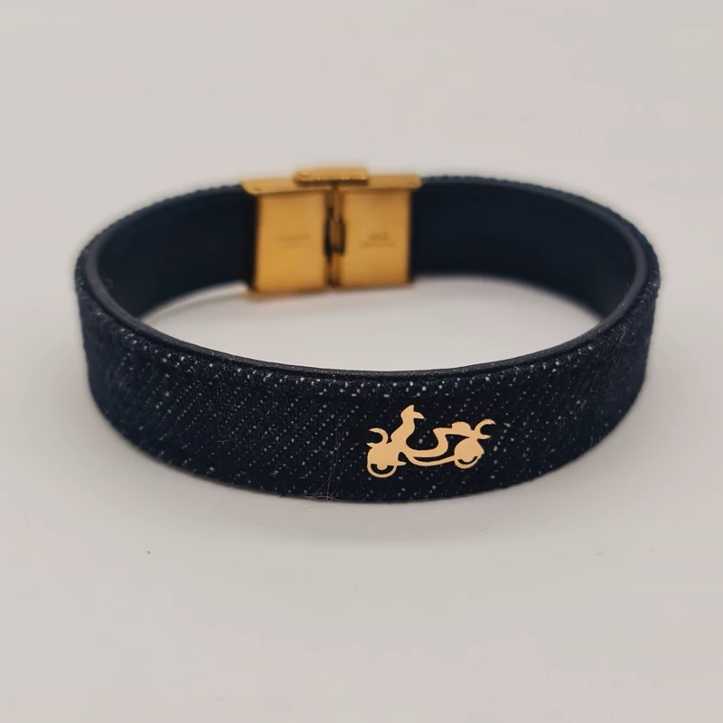 دستبند چرم و جین با پلاک طلا موتور