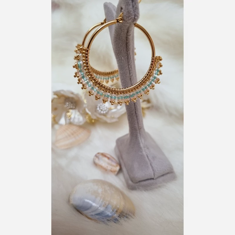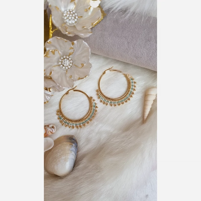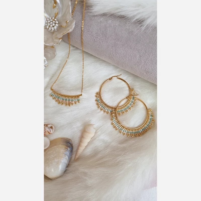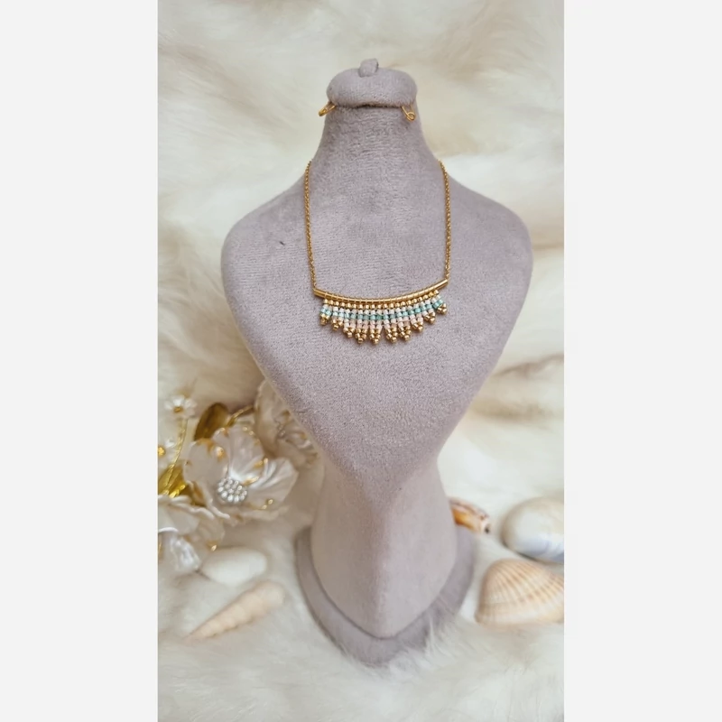 نیمست دستساز شامل گوشواره و گردنبند، ساختهشده با منجوقهای ژاپنی بسیار ریز و باکیفیت. رنگهای ملایم آبی، کرم و صورتی در کنار طلایی ثابت، ظاهری مدرن و مینیمال به این ست دادهاند.